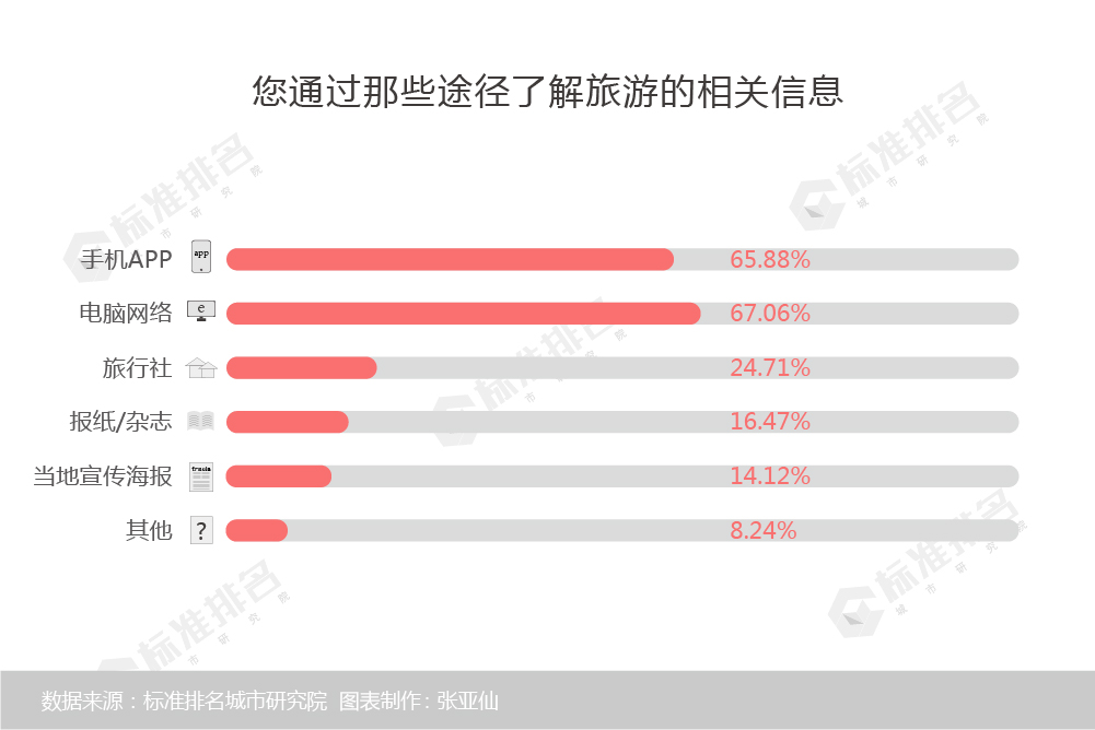 现在的旅游景区的宣传力度都很大,大家可以在网络、杂志、APP等途径了解旅行的相关信息和当地特点,65.88%通过手机APP了解的信息,67.06是通过电脑网络,24.71%是通过旅行社,16.47%是通过报纸/杂志,还有14.12%和8.24%,来自当地宣传海报和其他途径来了解旅行的信息。