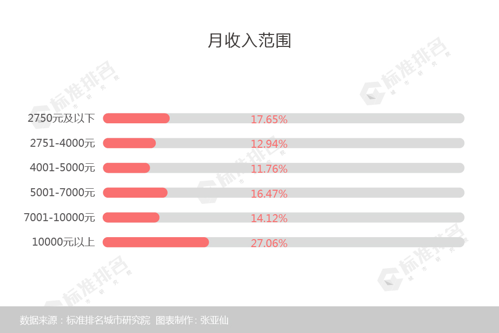 17.65%的人月收入在2750以下,12.91%的人月收入2751-4000元,11.76%在4001-7000元,16.47%在5001-7000元,14.12%和27.06%在7001-10000元和10000元以上。尽管受机票、酒店等价格上涨影响,春节期间大部分旅游线路价格较平时上浮约20%,部分产品价格涨幅甚至翻番,但这并未能阻挡消费者旅游过年的步伐。