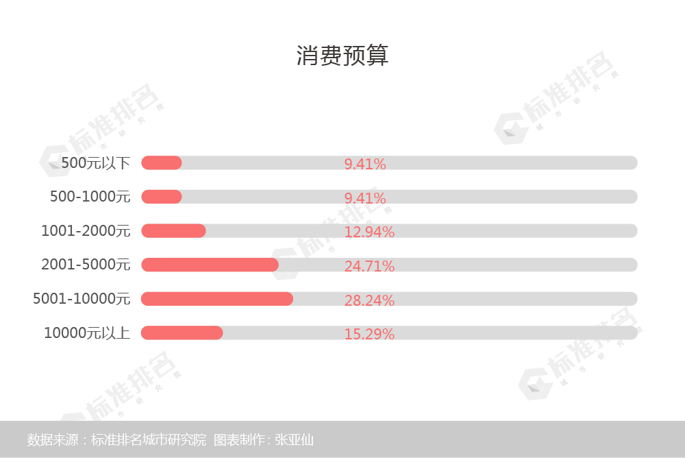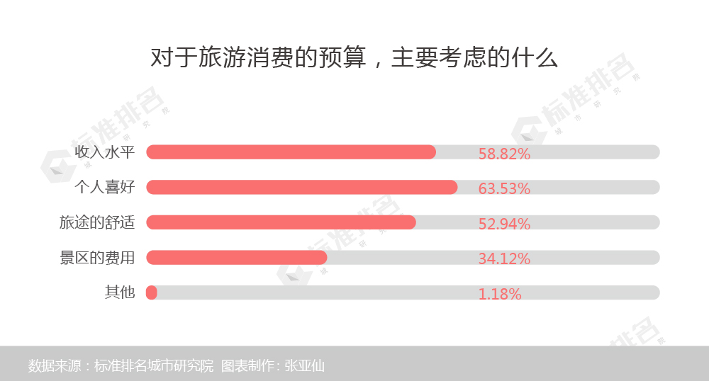 很多人会结合个人的喜好、旅途的舒适和自己的收入水平来选择理想的旅游目的地,所以个人喜好、收入水平和旅途舒适各占63.53%、58.82和52.94。对于旅行的消费预算,随着大批年轻用户的成长,用户需求的改变,人们对于旅行质量的要求有了显著提升,大批优质旅游资源进入市场——更多高端度假酒店和优质的体验项目、个性化的管家和向导服务等优质产品获得了消费者的青睐。28.24%这一大部分人都选择了在旅游的预算上在5001-10000元,还有15.29%的预算是在10000元以上。