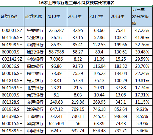 进入2011年以来,商业银行的不良贷款余额一直呈现不断增长的态势。根据WIND统计数据显示,平安银行近3年以来的不良贷款增长最快。2010年,平安银行的不良贷款余额为23.63亿元,到2013年末,其不良贷款余额增长到75.41亿元,增长两倍还多,年均不良贷款的复合增长率达47.23%,位居全部A股上市商业银行首位。兴业银行和中信银行分别以41.90%和32.76的增幅位居二三位。