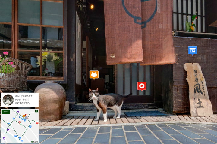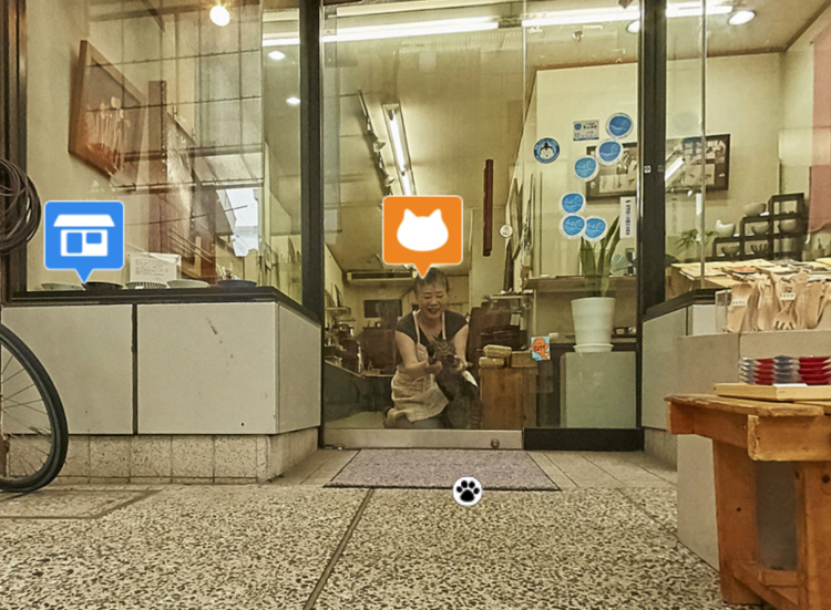 相应的,尾道市是以猫文化著称的。打开谷歌全景地图,顺着猫的爪印,你会发现原本人类熟悉的街道,全都有了不一样的体验:顺着猫的高度把视角变低,街道、门框、栅栏全都宽广了许多,时不时还有喵喵的声音。街景还有一些橘色方框标注的彩蛋,点击就会跳出猫咪的个人档案。