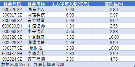 剔除尚未开板的新股,全天共计46只个股净流入额超1亿元。京东方A(000725.SZ)、网宿科技(300017.SZ)、东方财富(300059.SZ)更是受到主力资金的偏爱,分别净流入6.98亿元、6.03亿元、5.98亿元。网宿科技午后封涨停后打开,尾盘再度放量涨停。此外,华夏航空(002928.SZ)、润建通信(002929.SZ)、赢时胜(300377.SZ)均获资金抢筹后涨停,其净流入额分别为3.32亿元、2.99亿元、2.89亿元。