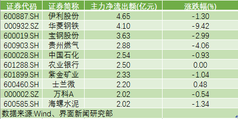 今日共有32只个股净流出额超1亿元。伊利股份(600887.SH)以4.65亿元的净流出额居首。刚刚摘星脱帽的华菱钢铁(000932.SZ)受冷遇,遭主力抛售近4.0亿元,盘中打开跌停后收跌9.42%。贵州燃气(600903.SH)净流出2.88亿元,股价下挫4.06%。