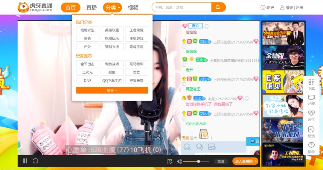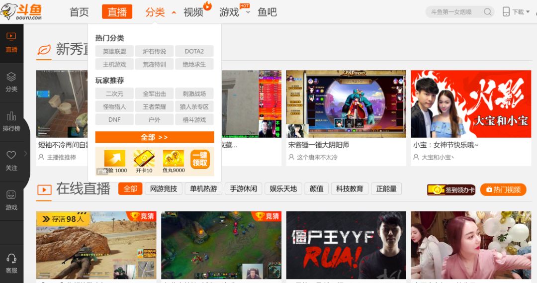 举一个最简单的例子,打开斗鱼PC端,直播类6个热门分类关键词,有2个游戏是和腾讯有关,分别是英雄联盟和绝地反击,这也是腾讯旗下游戏的拳头产品;而在虎牙PC端9个热门分类中,腾讯旗下的英雄联盟、绝地反击和王者荣耀高居前三。
