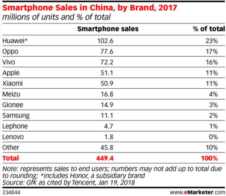 具体到中国手机市场,据调研机构GFK发布的2017年中国智能手机市场研究报告显示,联想去年在中国智能手机市场前10排名中垫底,出货量仅为179万部(注:2016年的销量为300万部),同比下滑接近60%,占有率为0%。这里需要提前指出的是,由于GFK采用的是sell-out的统计方式,即统计的最终到消费者手中的出货量,不包括已经出货,但是仍在仓库、渠道的量,所以这个数据相比其他研究机构采用的sell-in的统计方式的数据量要偏低。与此同时,市场调查机构eMarketer也出具了一份类似的排名。