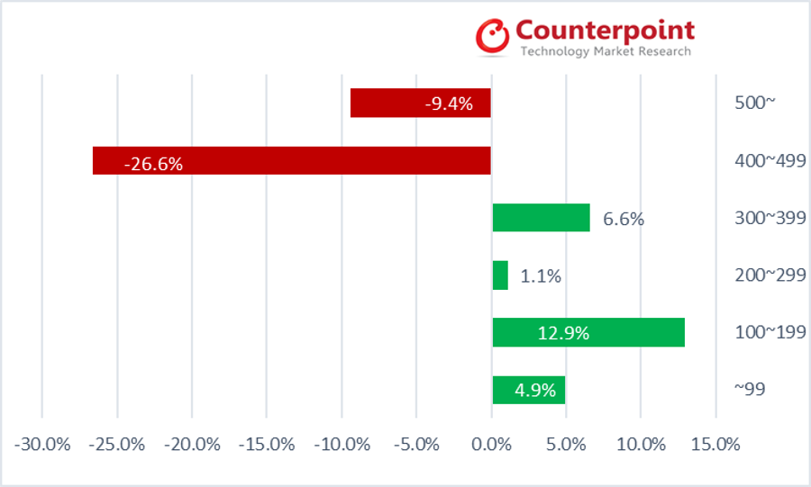 最后看拉美市场。表面其相较于上述的印度和北美市场,联想的领先优势明显(以11.6%的占有率位居第二位),且增速最快(其年比年出货量同比增长56%),但从拉美市场的增长动力看,去年100—199美元机型的增长幅度高达12.9%;其次是300—399美元的机型,增长幅度为6.6%;99美元以下机型增长幅度为4.9%,排在第三。相比之下,400—499美元和500美元以上机型则大幅下降了26.6%和9.4%,这意味着联想去年在拉美市场的增长动力更多是来自中低端机,这也是为何联想在上季财报中只是提及所属拉美市场的墨西哥和巴西市场份额与销量双翻倍增长,但却回避营收和利润的主要原因。同样,随着今年中国手机厂商,尤其是在印度击败和取代联想的小米重返拉美市场(例如巴西),联想能否延续在拉美市场的领先优势变数陡增。