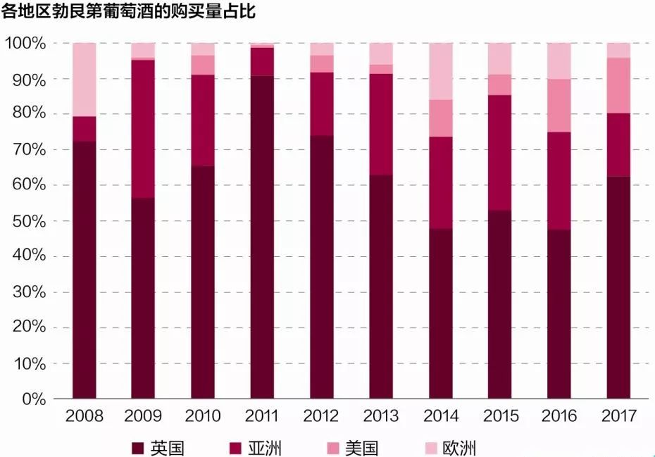 目前,Liv-ex约20%的会员位于亚洲,但他们占到该平台勃艮第酒交易额的20%~30%。2017年,这一比例有所降低,因为英镑贬值,英国酒商借机屯货。当然,英国酒商也并非仅卖给英国人,其中相当一部分流入了其他国家。