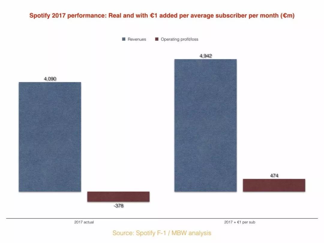 那么,假如Spotify选择在7100万付费会员的基础上,每人加价1欧元的话,会发生什么?答案是,一旦加入假设数据,那么Spotify在去年12个月的营收将有望达到49亿欧元,而它的运营亏损也将会变成一笔可观的运营利润。