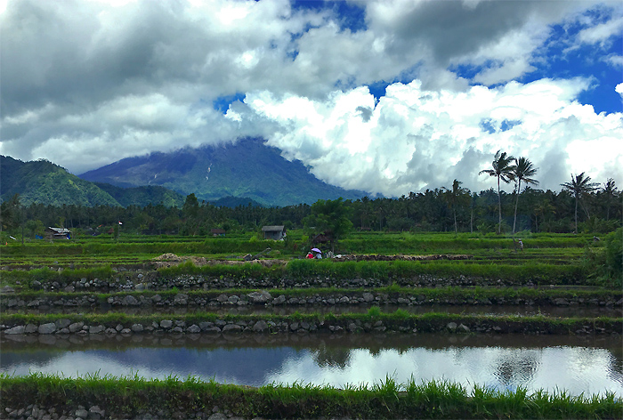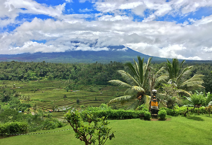 巴厘岛的马哈吉利全景度假村(Mahagiri Panoramic)位于岛屿东北部的卡朗阿森县(Karangasem Regency),藏身远离海岸线的内陆地区,却有着全巴厘岛最有名的圣山和最美丽的梯田。在度假村的户外餐厅,层层叠叠的梯田周边,围绕着肥硕丰润的热带植物,浓厚的绿色在湿漉漉的土地上无边无际地蔓延开来,绿意的尽头是蓝天白云下的阿贡火山,大朵的云团从火山口上方飘过,天空低矮而澄澈。