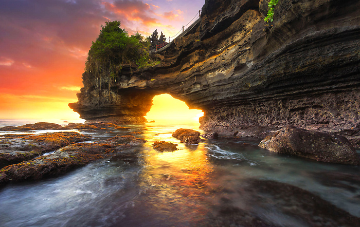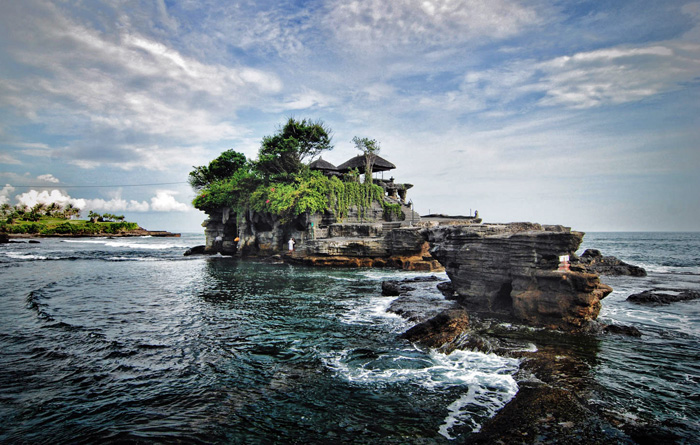 海神庙(Tanah Lot)是巴厘岛当地最有名的景点之一,也是较受中国游客欢迎的一个地方。这里香火鼎盛,海岸线曲折,每到傍晚6点左右,日落同寺庙交相辉映,潮起潮落溅起的浪花拍打着岩石,因此也被誉为整个巴厘岛最美的夕阳风景。但同时,神庙规定非印度教徒不得入内,对于大部分游客来说,只能远远地站在护栏后面隔岸观“庙”。