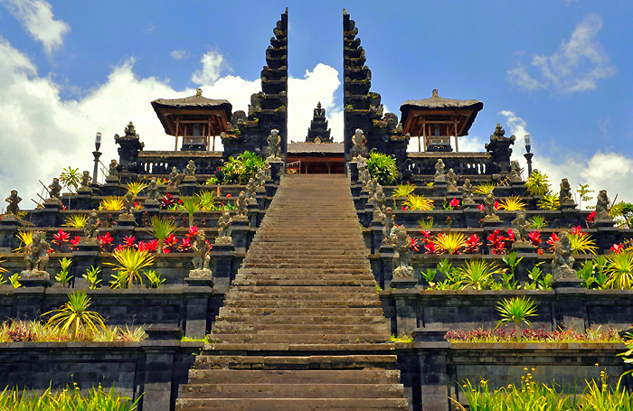 如果想进一步欣赏巴厘岛神庙的细腻和美丽,不妨前来阿贡火山。因为在巴厘岛人看来,火山本身就是神,火山爆发就是神的发怒。他们在火山上建造神庙、摆放祭品,乞求山神息怒并恩准他们在肥沃的火山灰土壤上耕种、畜牧,安居乐业。因此,作为巴厘岛最大的火山,阿贡火山自然成为巴厘岛人眼中的“神山”。而在半山腰处,同样也有着岛上最古老和最大的印度教神庙:百沙基母庙(Pura Besakih)。