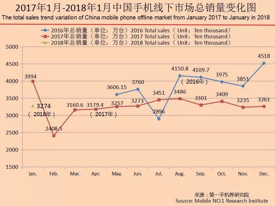 第一手机界研究院根据覆盖全国25个省/直辖市/自治区221个城市,10034家线下手机实体店的销售数据统计结果计算,2018年1月中国大陆整体手机线下市场共完成销量3274万台,同比下滑18%,环比2017年12月上升了0.4%。