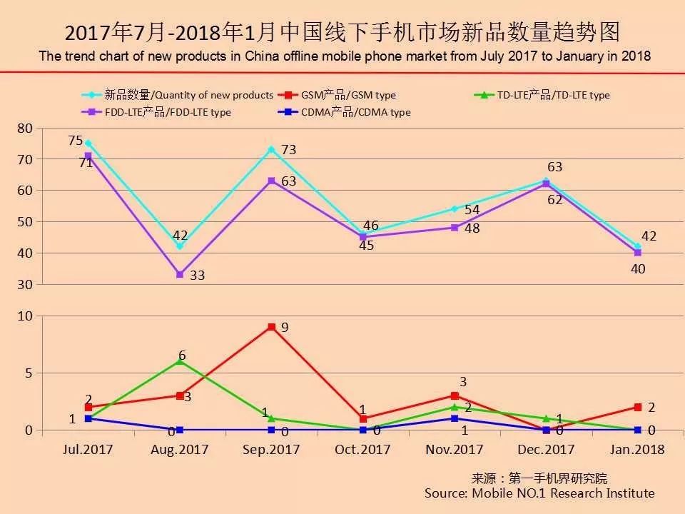 2018年1月,中国大陆手机线下市场共有42款新品推出,2款GSM产品和40款FDD-LTE产品。