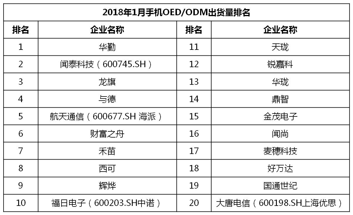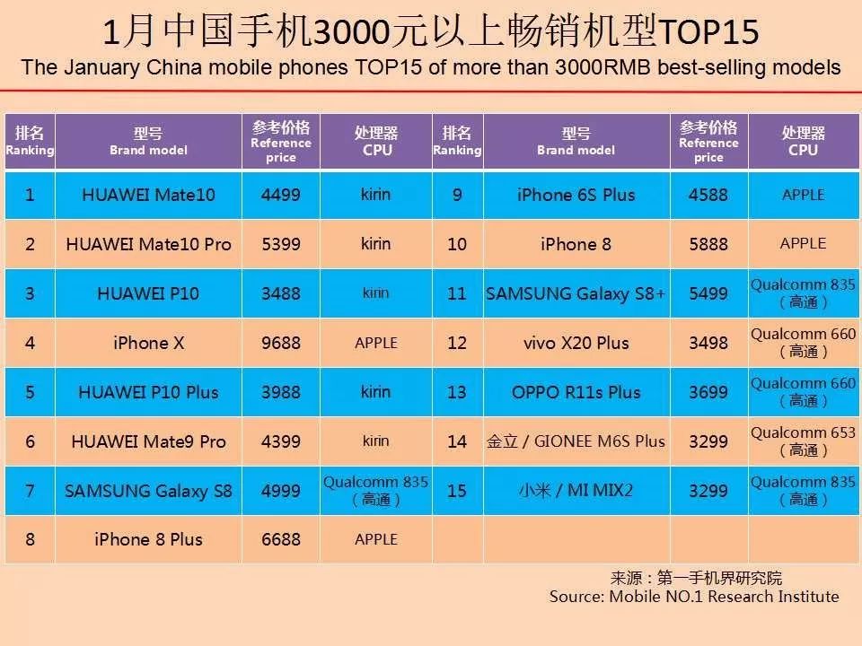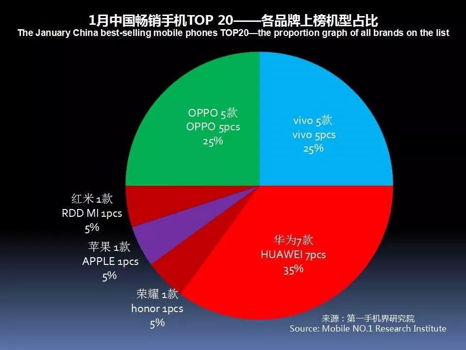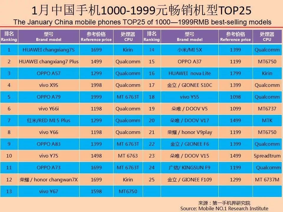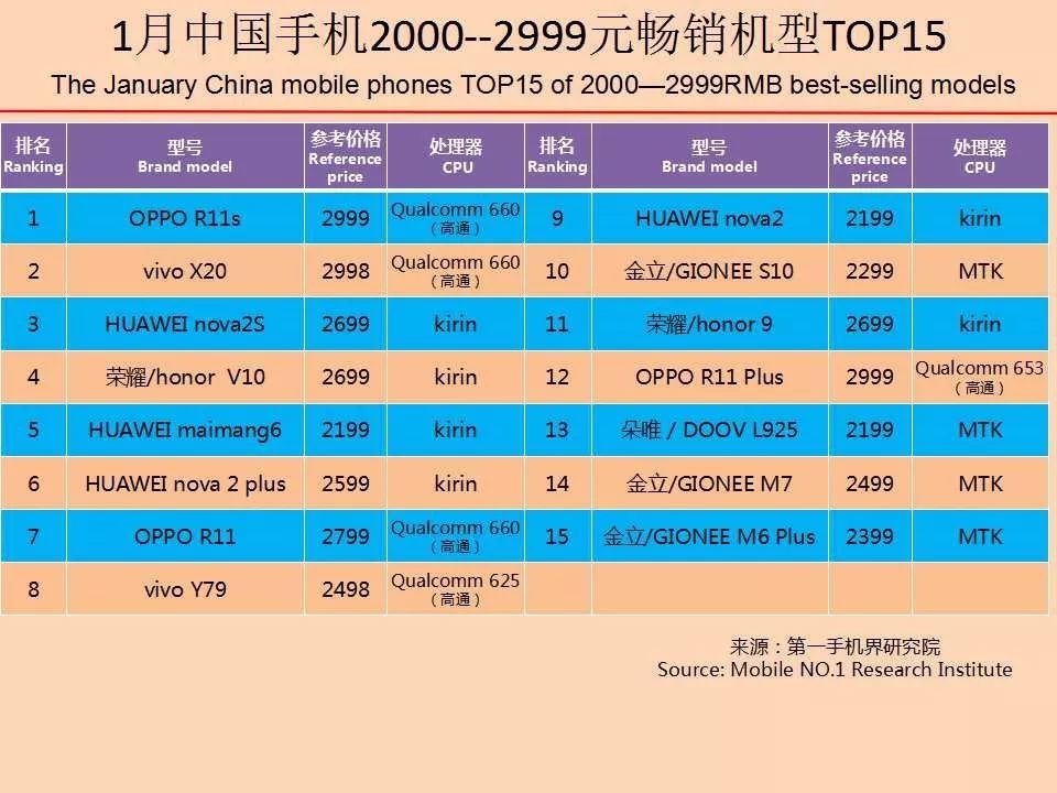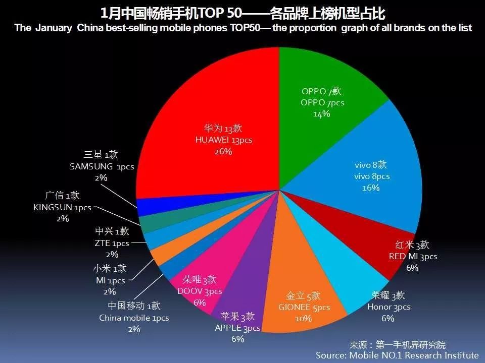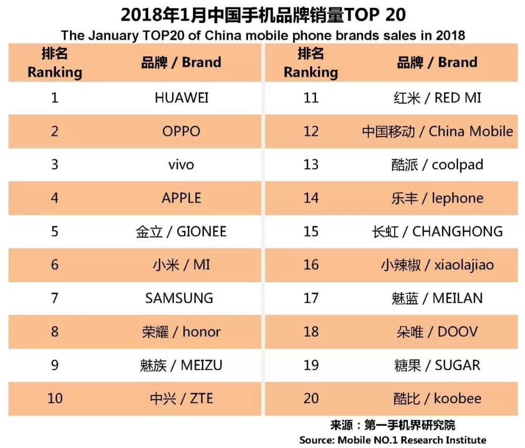 华为、OPPO、vivo、苹果、金立、小米、三星、荣耀、魅族、中兴成为1月中国手机品牌销量TOP 10。