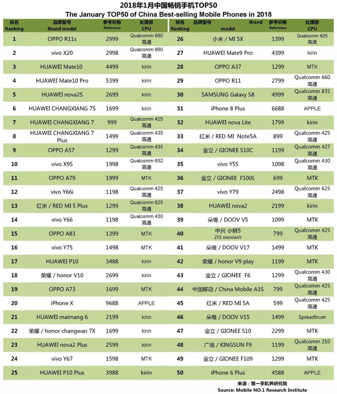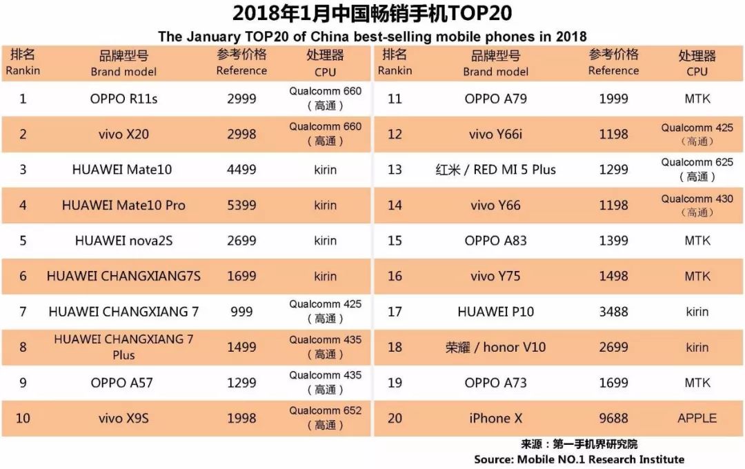 OPPOR11s 、vivo X20 、华为 Mate10 、华为 Mate10 Pro 、华为 nova2S、华为 畅享7S、华为 畅享7 、华为 畅享7Plus、OPPO A57、vivo X9S成为1月中国畅销手机TOP 10。