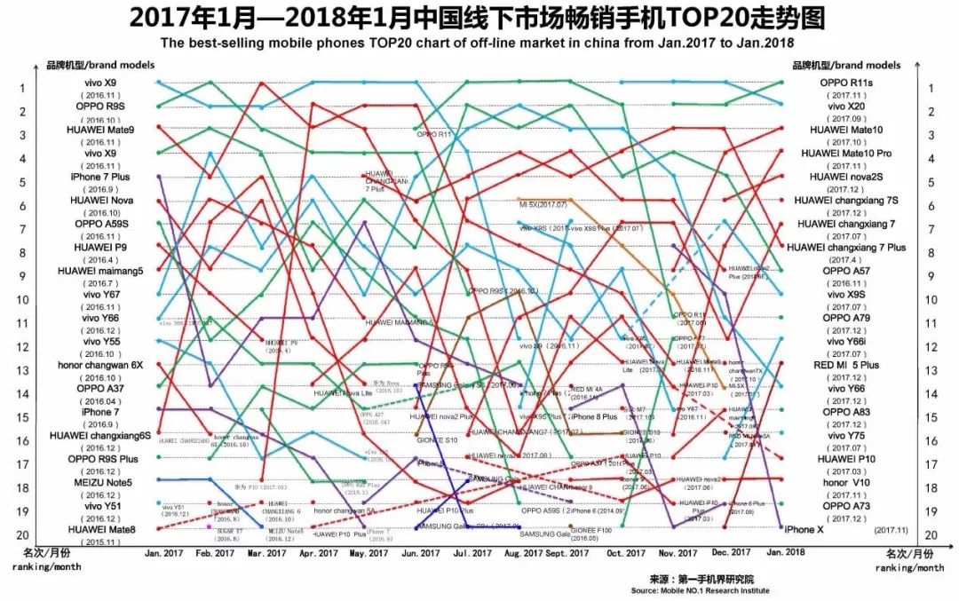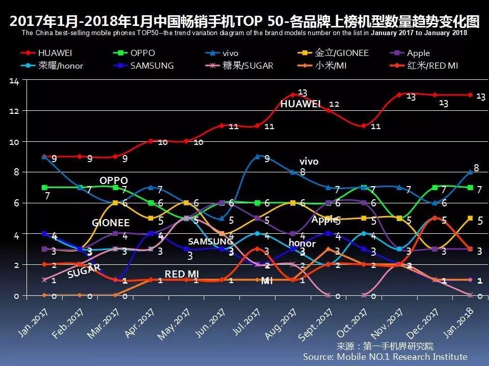2018年1月在中国大陆线下渠道走量的手机机型基本分布是:华为14款、vivo11款、OPPO10款、金立7款、荣耀6款、红米、苹果、朵唯各4款,三星和中国移动各2款、小米、中兴、小辣椒、酷派、努比亚、广信、鑫益达、百合各1款。