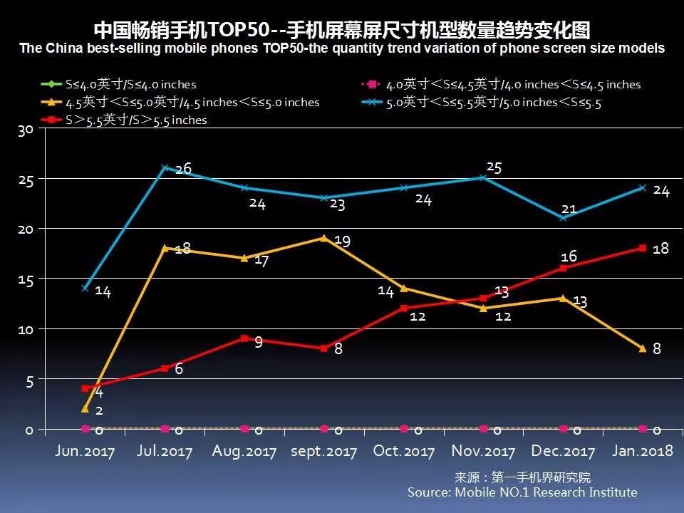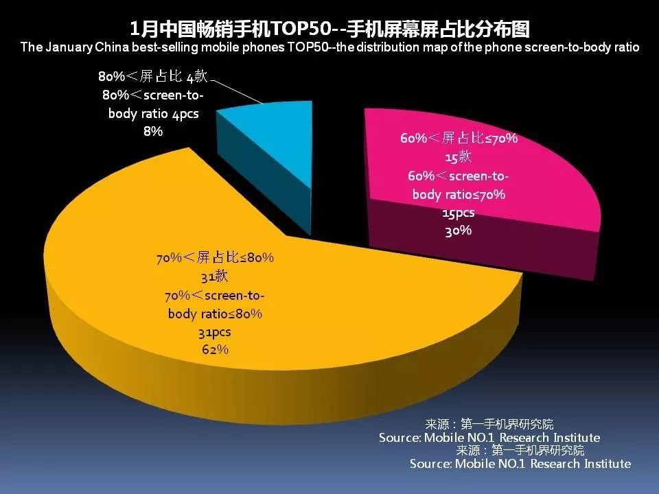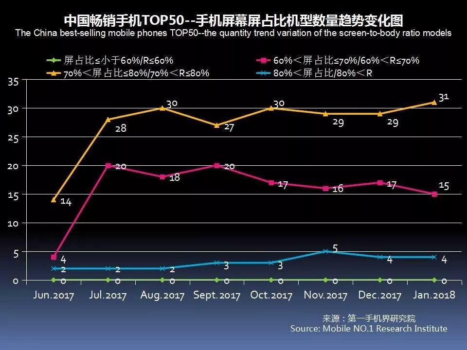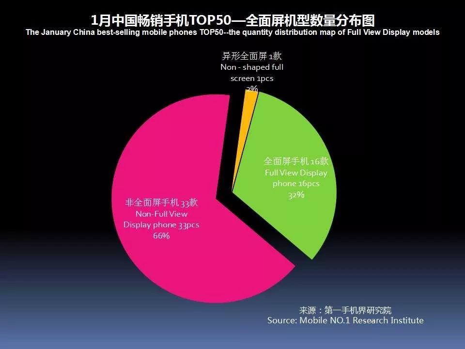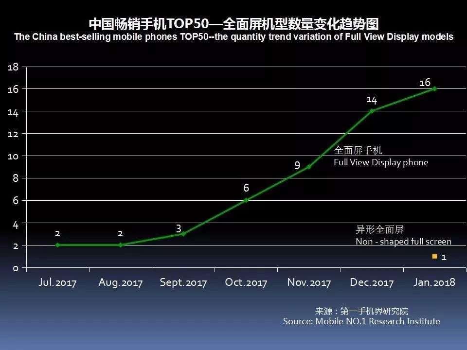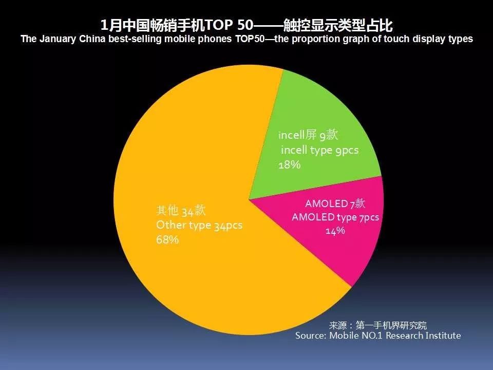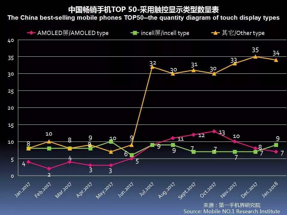 1月中国畅销手机TOP 50中,采用AMOLED屏下降至7款,说明全面屏已开始取代AMOLED成为手机卖点。