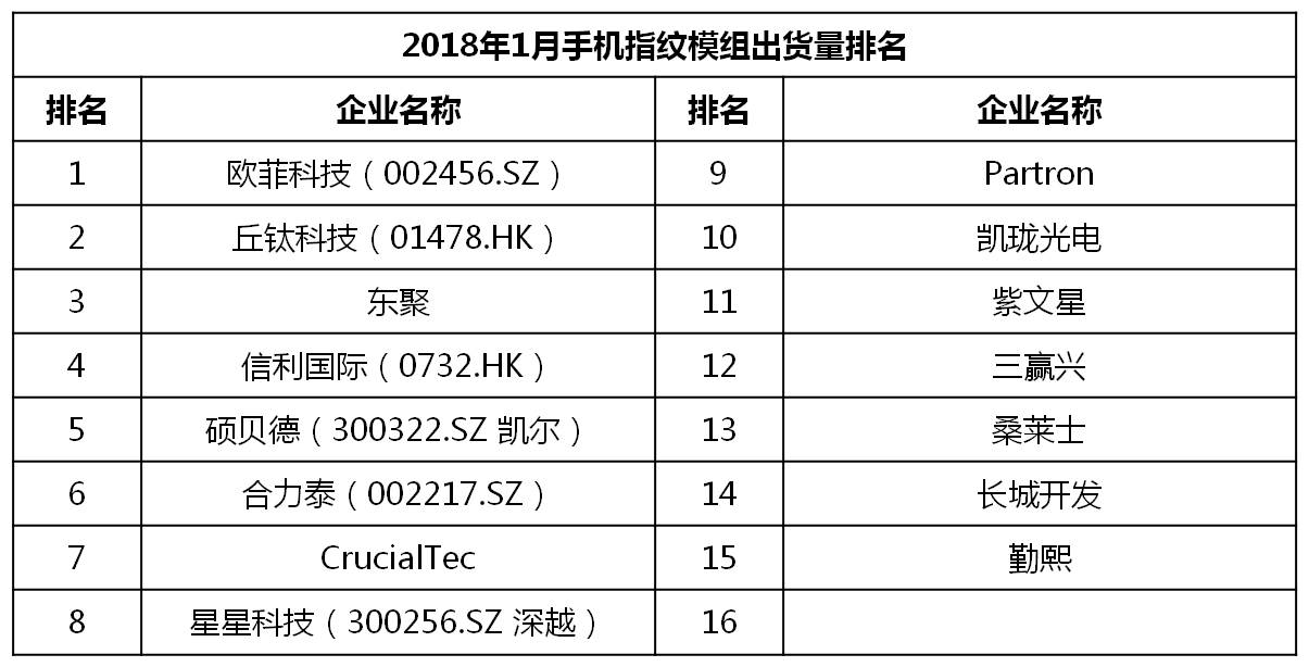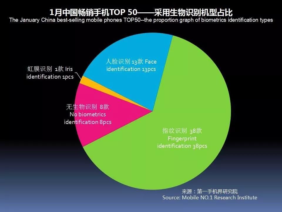 1月中国畅销手机TOP 50,采用指纹识别功能的手机有38款,占比76%;采用虹膜识别有1款,占比2%;采用人脸识别有13款,占比26%,没有采用生物识别功能的手机有8款,占比为16%。