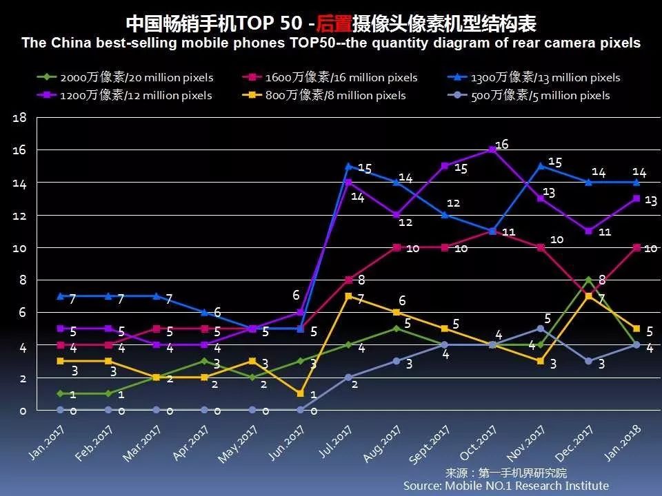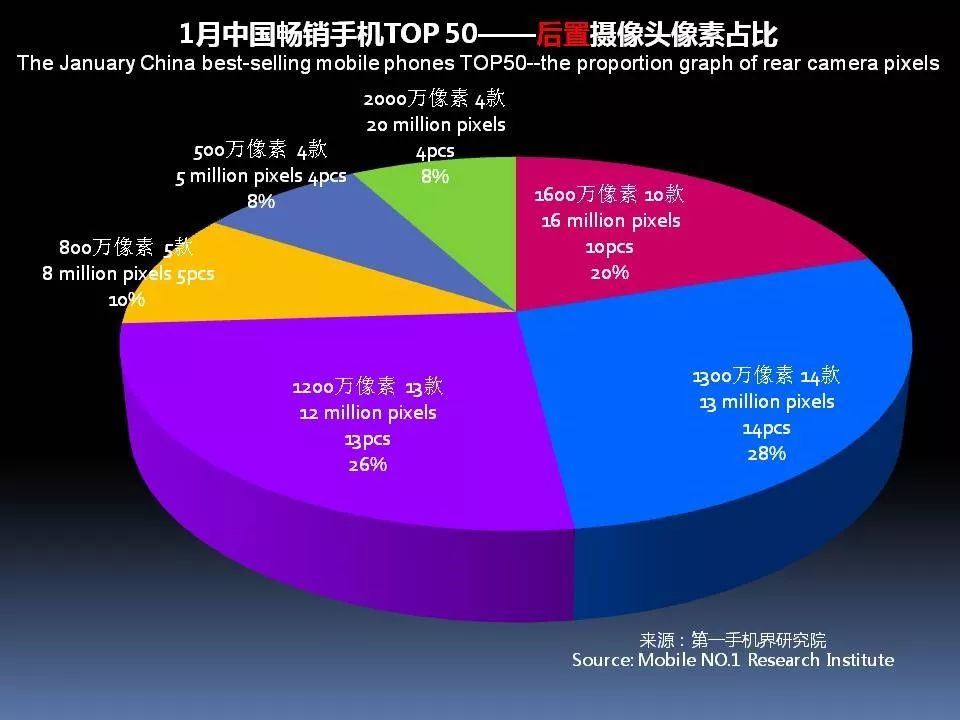 1月畅销手机TOP 50中,后置摄像头采用2000万像素的有4款,占比8%;采用1600万像素的有10款,占比20%。