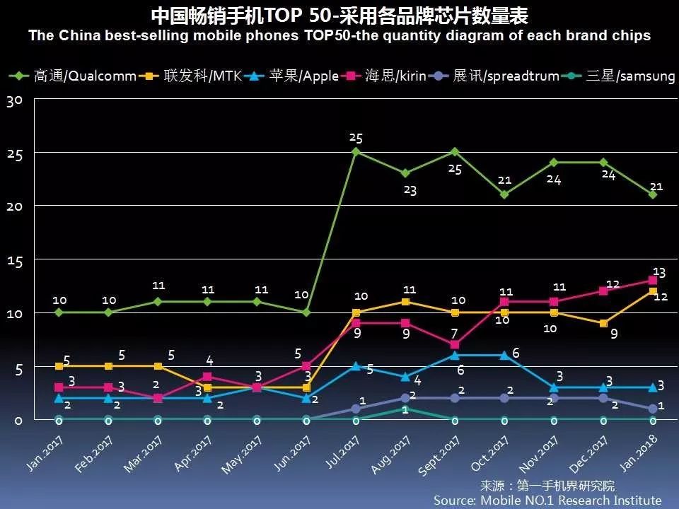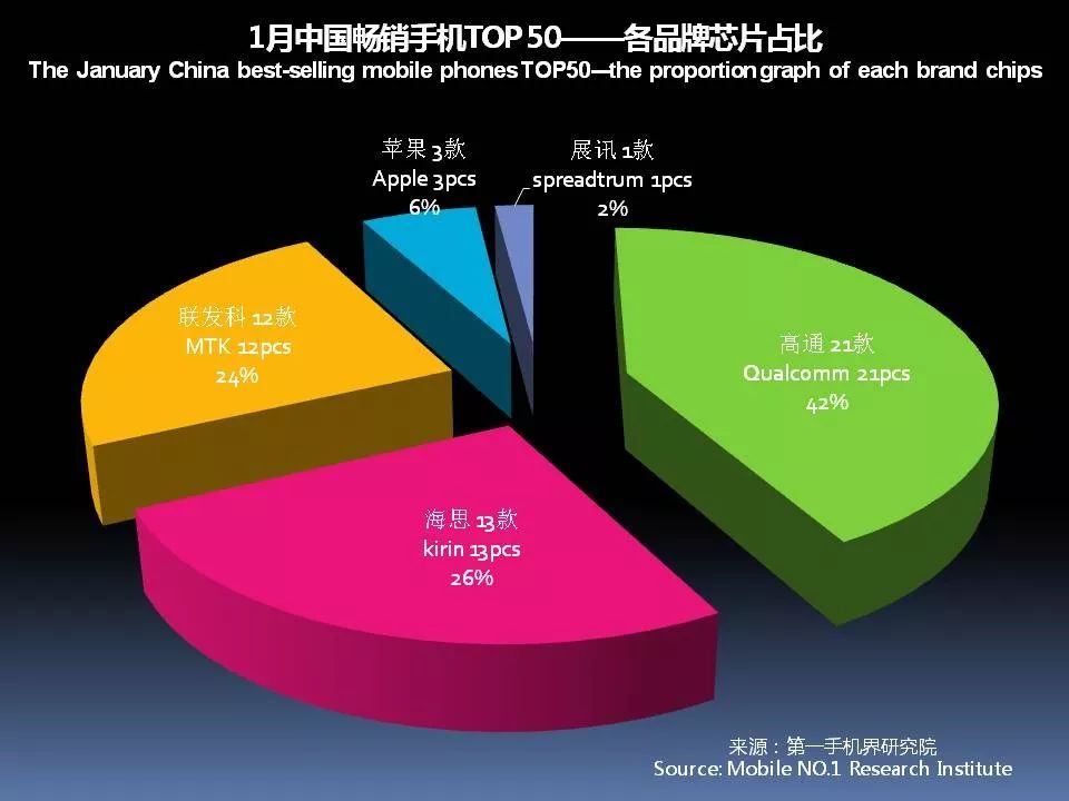1月中国畅销手机TOP 50中,采用高通芯片的有21款,联发科(MTK) 12款,海思13款,苹果3款和展讯1款。高通芯片占有率达42%的份额。