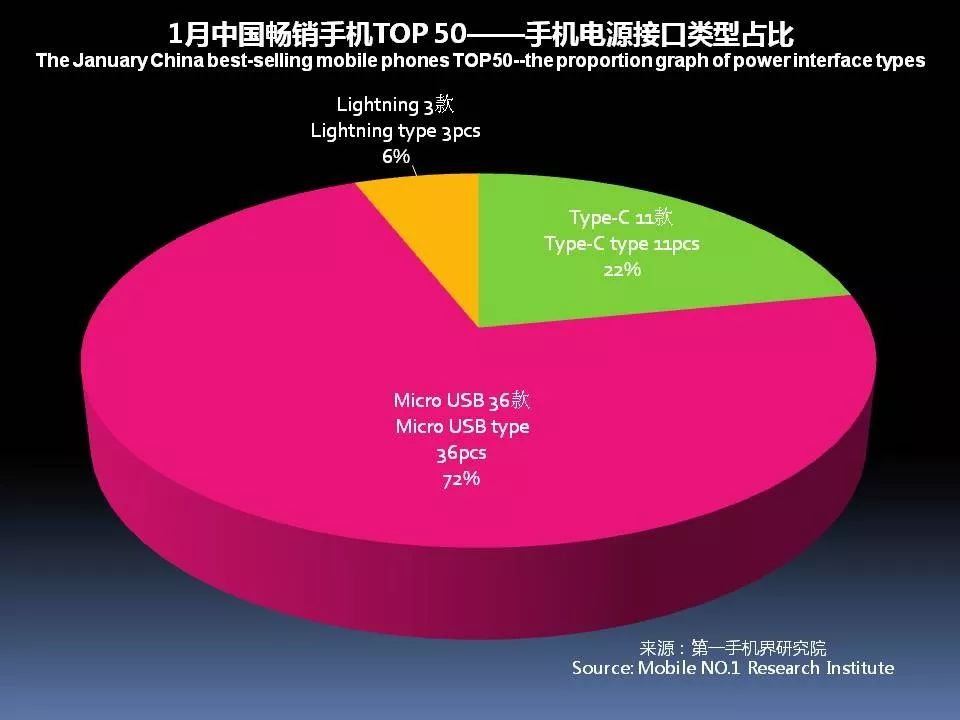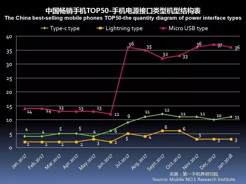 1月中国畅销手机TOP 50中,采用Type-c接口的机型已达到11款。