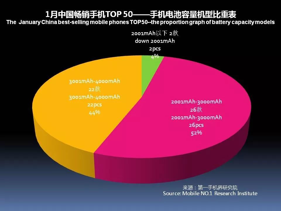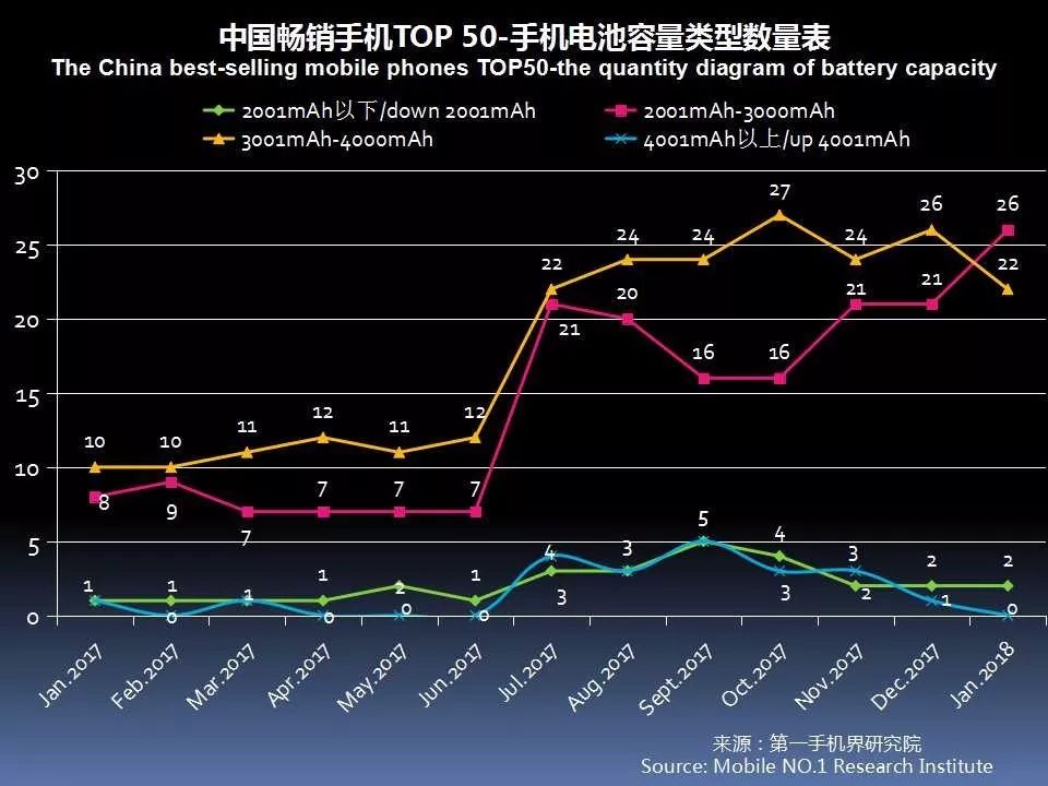 续航能力已经成为手机卖点之一,1月中国畅销手机TOP 50中,电池容量3001mAh-4000mAh的机型数量有22款。
