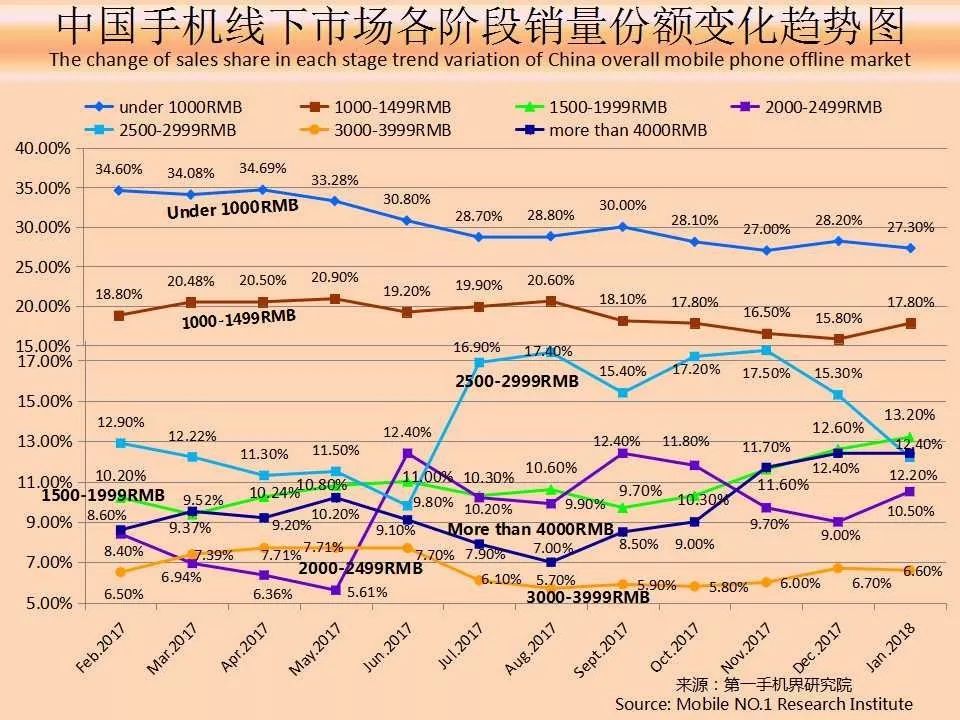 从中国手机线下市场各价格段销量份额变化趋势图可以看出,1000元以下的手机市场份额还处于下滑的通道之中。
