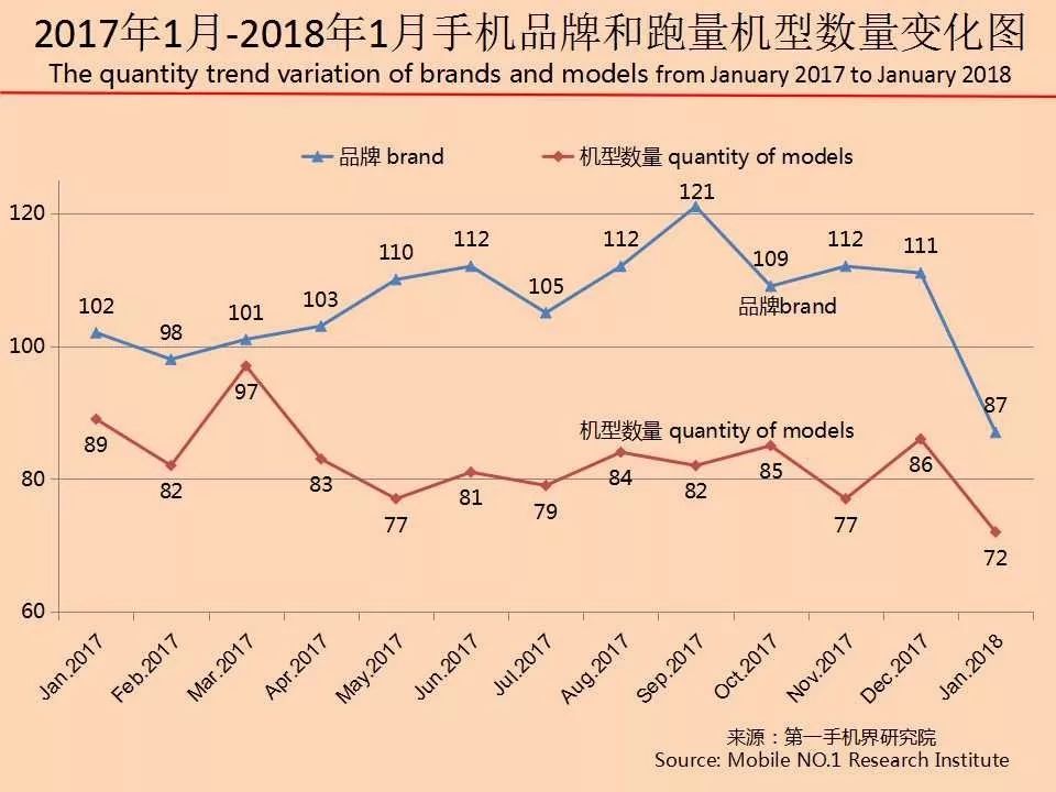 根据七星手机连锁、话机世界、广西王者通讯、四川龙翔通讯、广东丽的通讯、广东新星源手机数码连锁、黑龙江省凌志手机连锁、海南王者天创、山西太通科技、山西远大通讯、湖南齐欣通讯、江西丽华通讯、湖北九鼎通讯、吉林天天手机、云南九机网、甘肃悦达、陕西中人、河南兄弟通讯商会、河南国宇、河南胜天、江苏国网、河北润德、厦门中桥、迪信通、贵州诚讯、华伟通讯、大地通讯、重庆祥佳音、河北国通等全国手机连锁卖场销售数据统计结果显示,2018年1月在中国线下渠道销售的手机品牌达到87个,环比2017年12月111个,减少了24个;2018年1月有一定销量的手机机型达到72款,环比2017年1月86款,减少了14款。