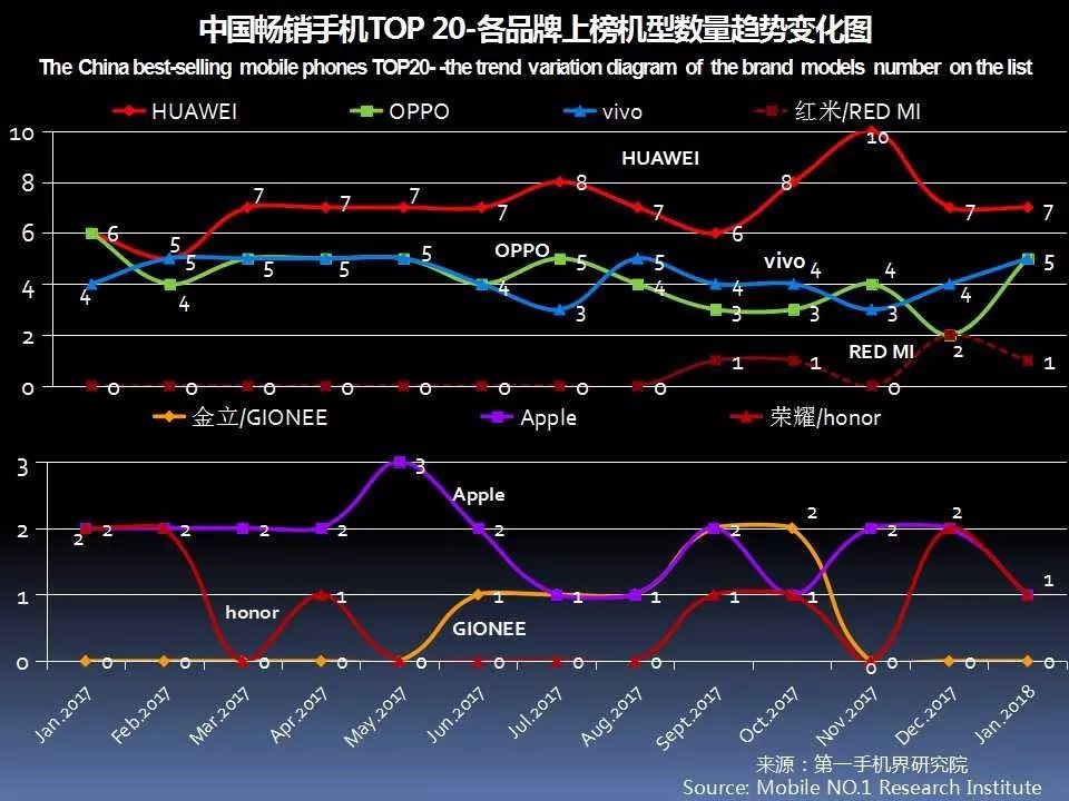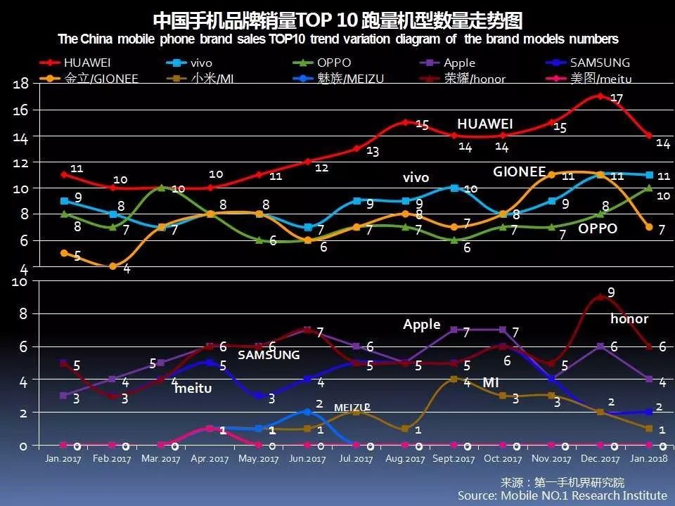 从中国手机品牌销量TOP10跑量机型数量走势图可以看出,金立1月的资金短缺问题,最终还是对市场有所影响。