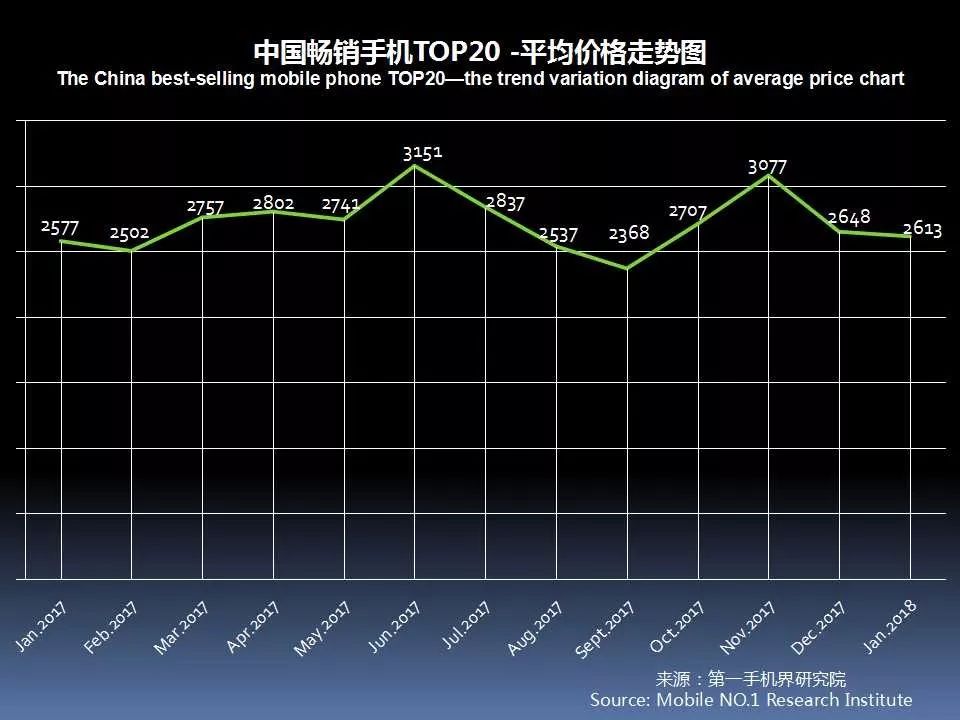 20款畅销手机平均价格在2613元,环比2017年12月2648元,下滑了1.4%,其中主要原因是由红米进入了中国畅销手机TOP20榜单。