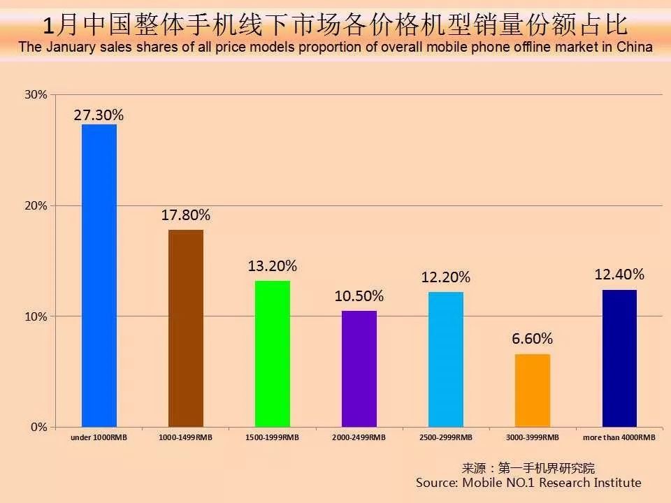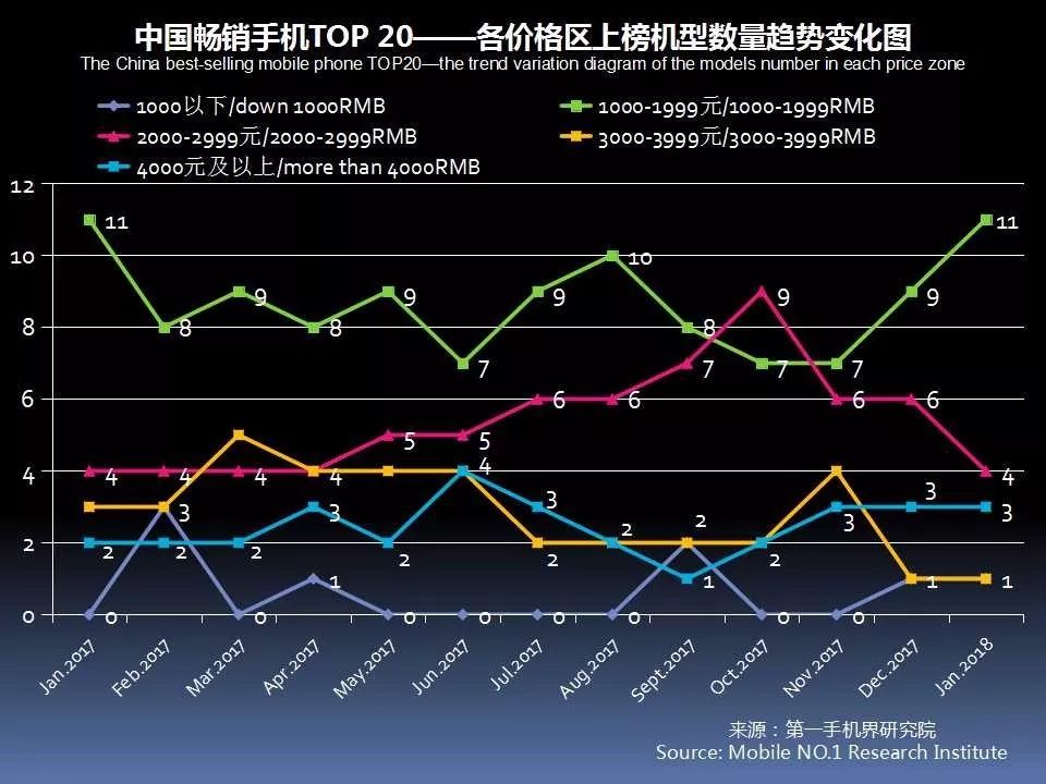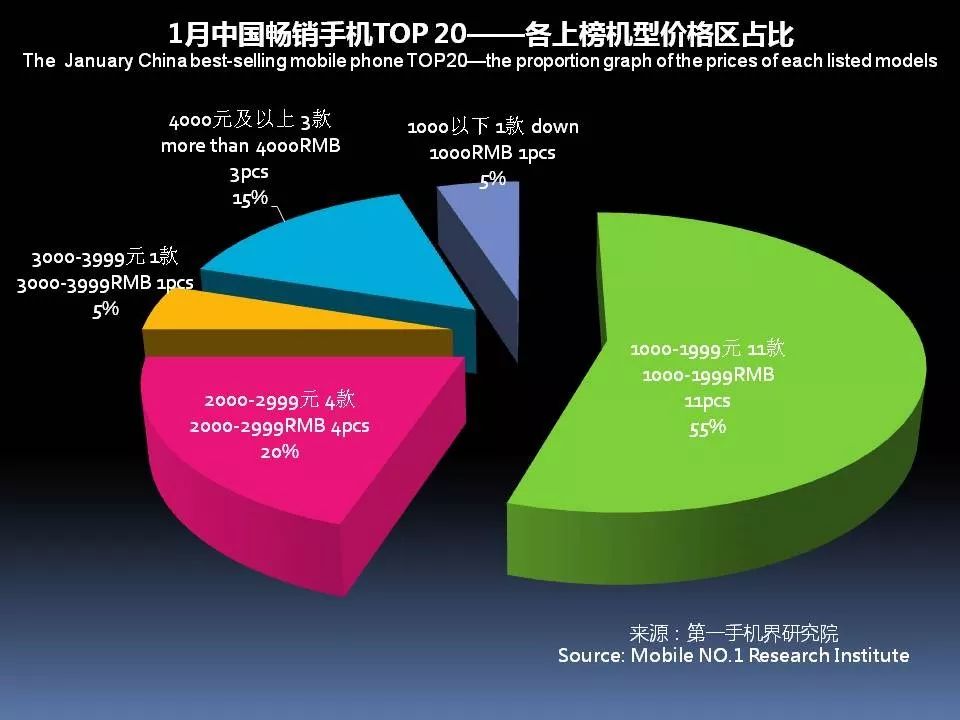 1月中国畅销手机TOP 20,超过2000元售价的机型占8款;1500-1999元价格段机型占4款;1000元-1499元价格段机型占7款;1000元以下的机型占1款。