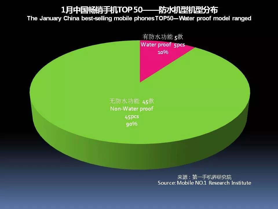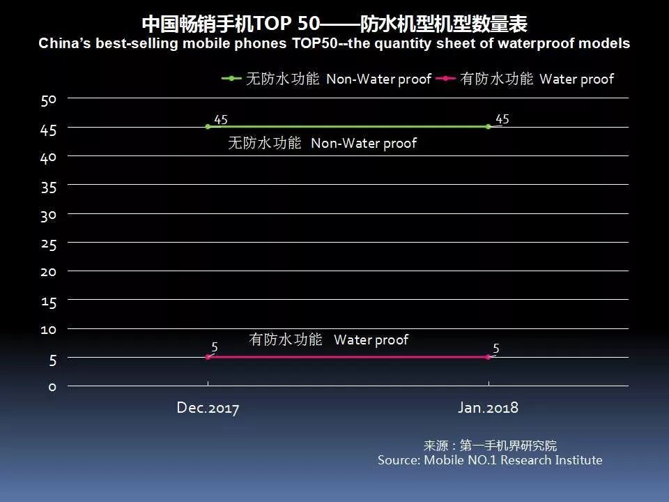 2018年1月畅销手机TOP 50中,具有防水功能的机型有5款,分别是华为 Mate10 、华为 Mate10 Pro 、iPhone X、三星 Galaxy S8、iPhone 8 Plus。
