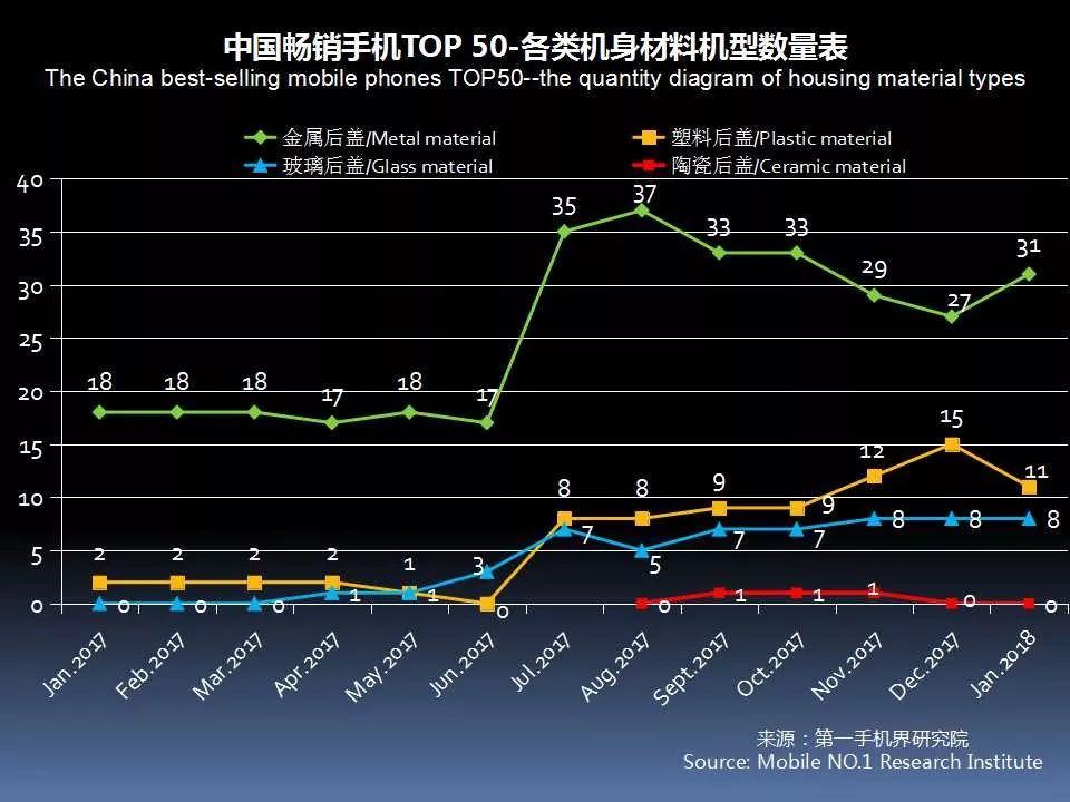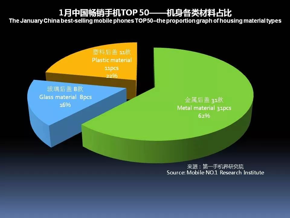 1月中国畅销手机TOP 50,采用金属后盖有31款,占比62%;玻璃后盖的有8款,塑料后盖有11款,陶瓷后盖0款。