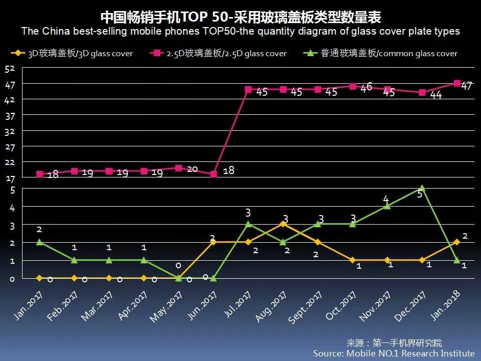 2018年1月中国畅销手机TOP 50中,采用3D玻璃盖板的手机只有三星Galaxy S8进入TOP 50。
