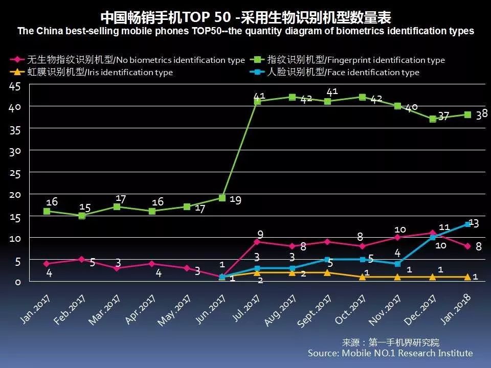 (备注:由于多个机型会同时拥有指纹、虹膜和人脸识别,故机型数量会有重叠)