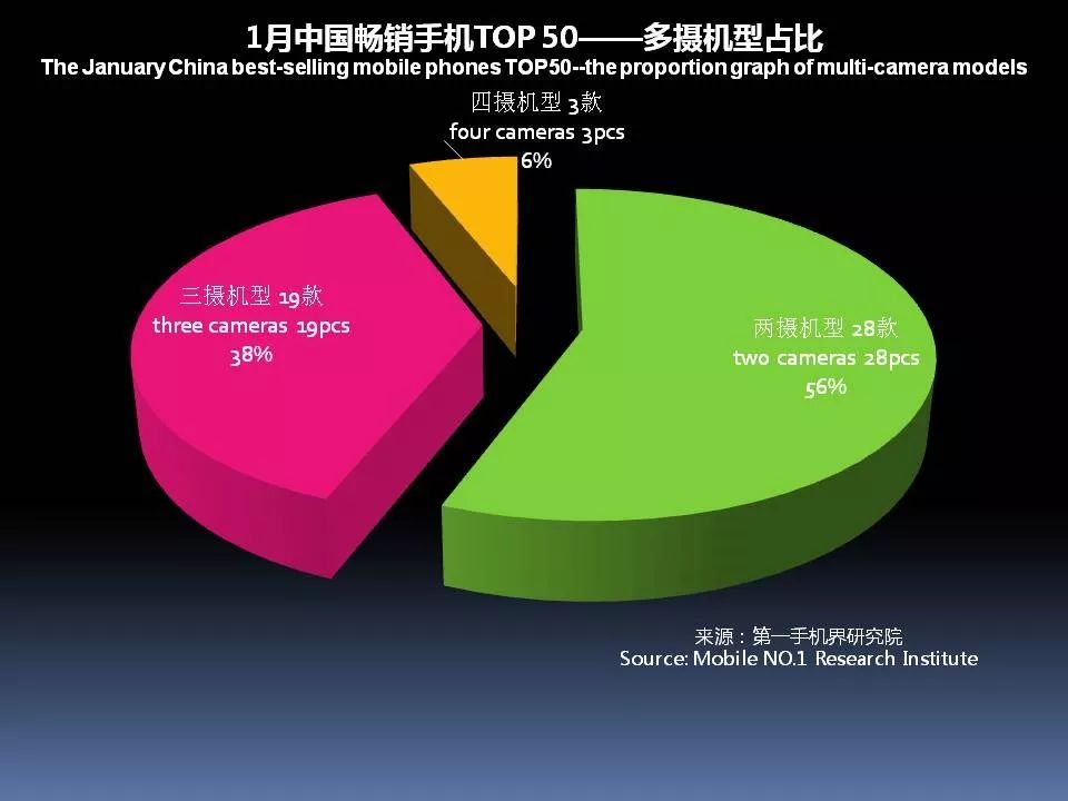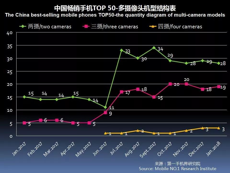 1月中国畅销手机TOP 50中,已有22款机型采用多摄像头设计,占比44%。