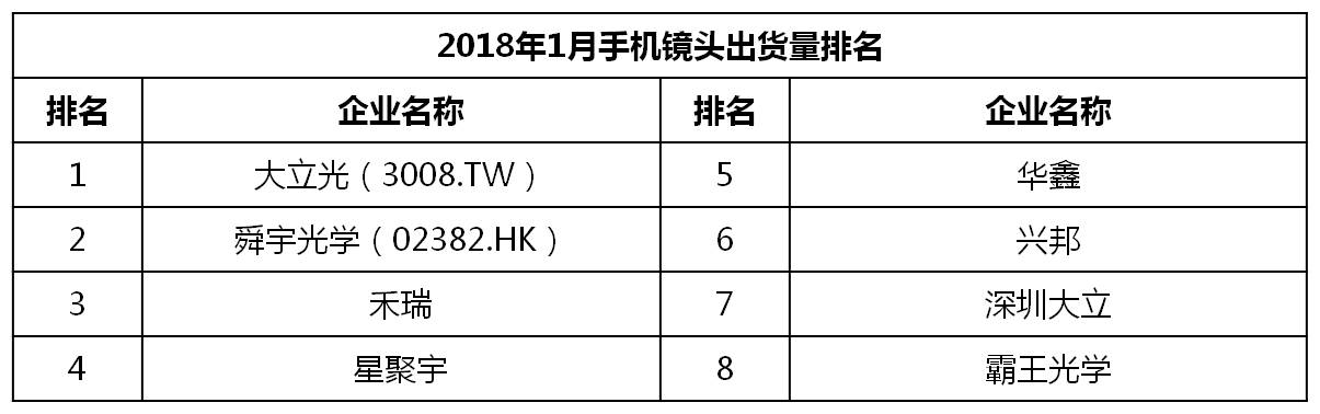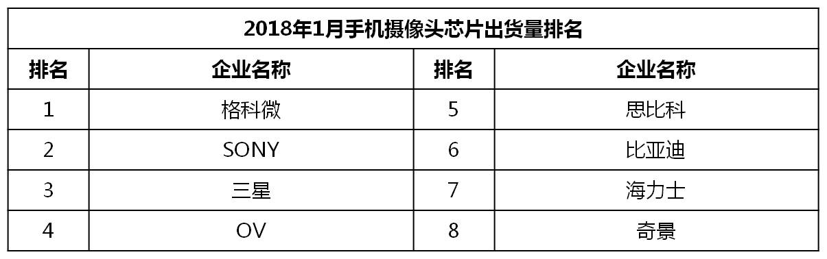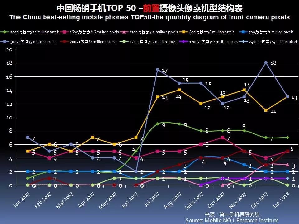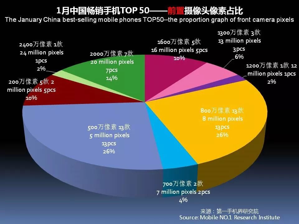 1月中国畅销手机TOP 50中,前置摄像头采用2000万像素的有5款,占比10%;采用1600万像素有5款,占比10%。