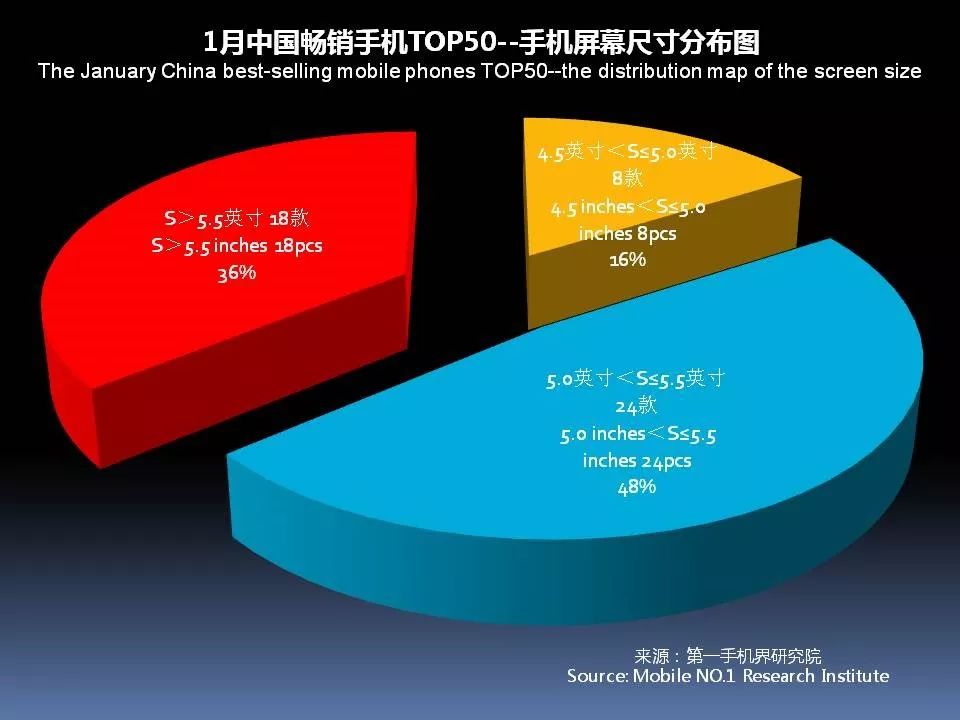 1月中国畅销手机TOP 50的手机屏幕绝大部分为5.0英寸-5.5英寸之间,占比达48%,但超过5.5英寸手机屏幕数量从12月的16款增加至1月的18款。手机屏幕屏占比在80%以上,有4款。