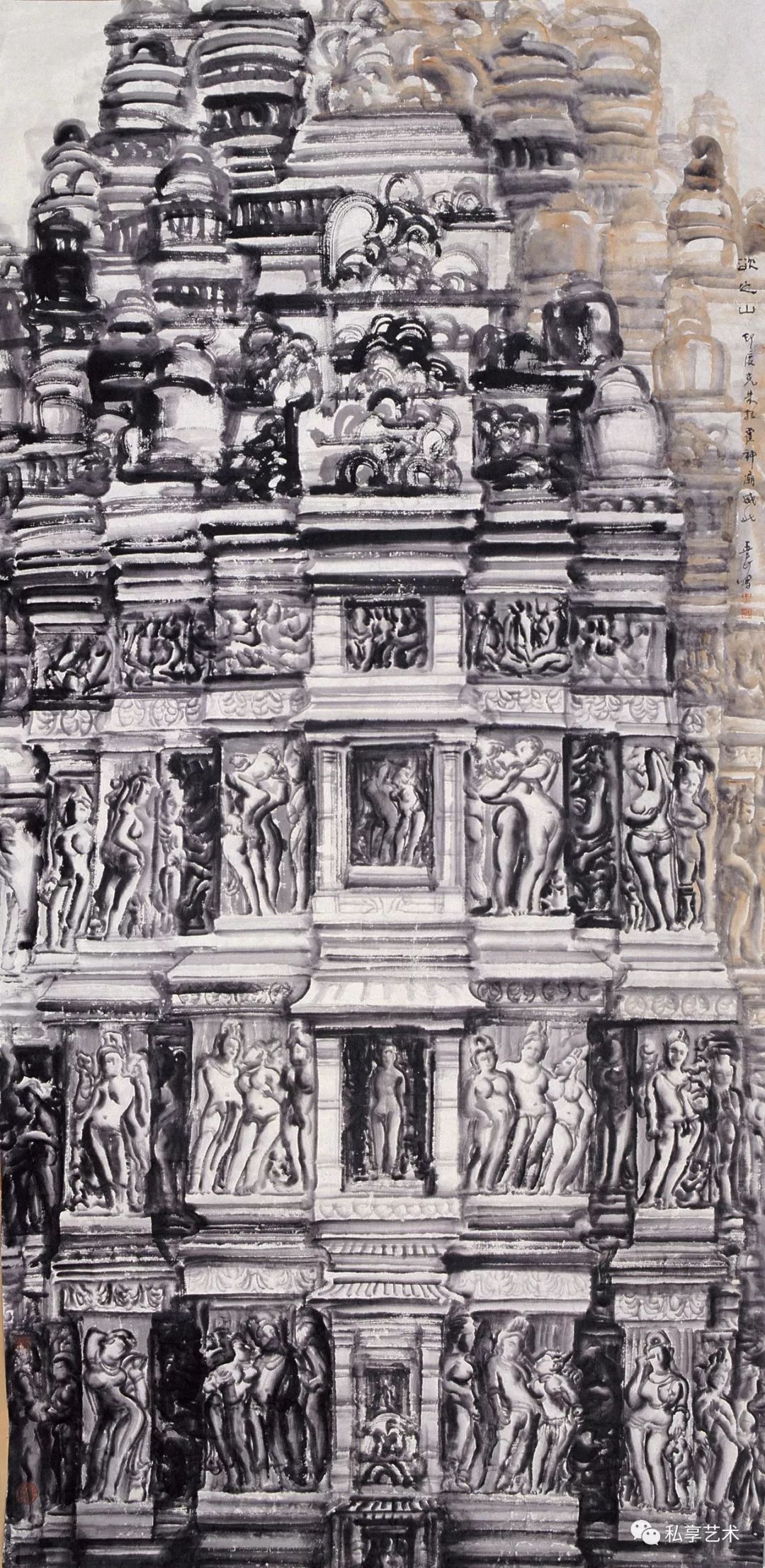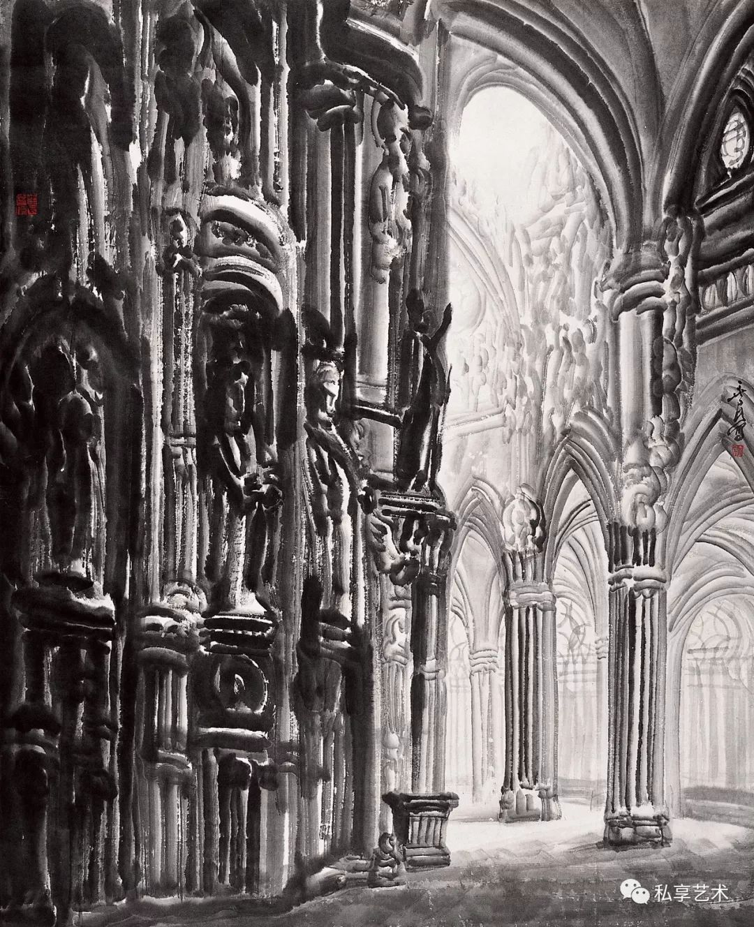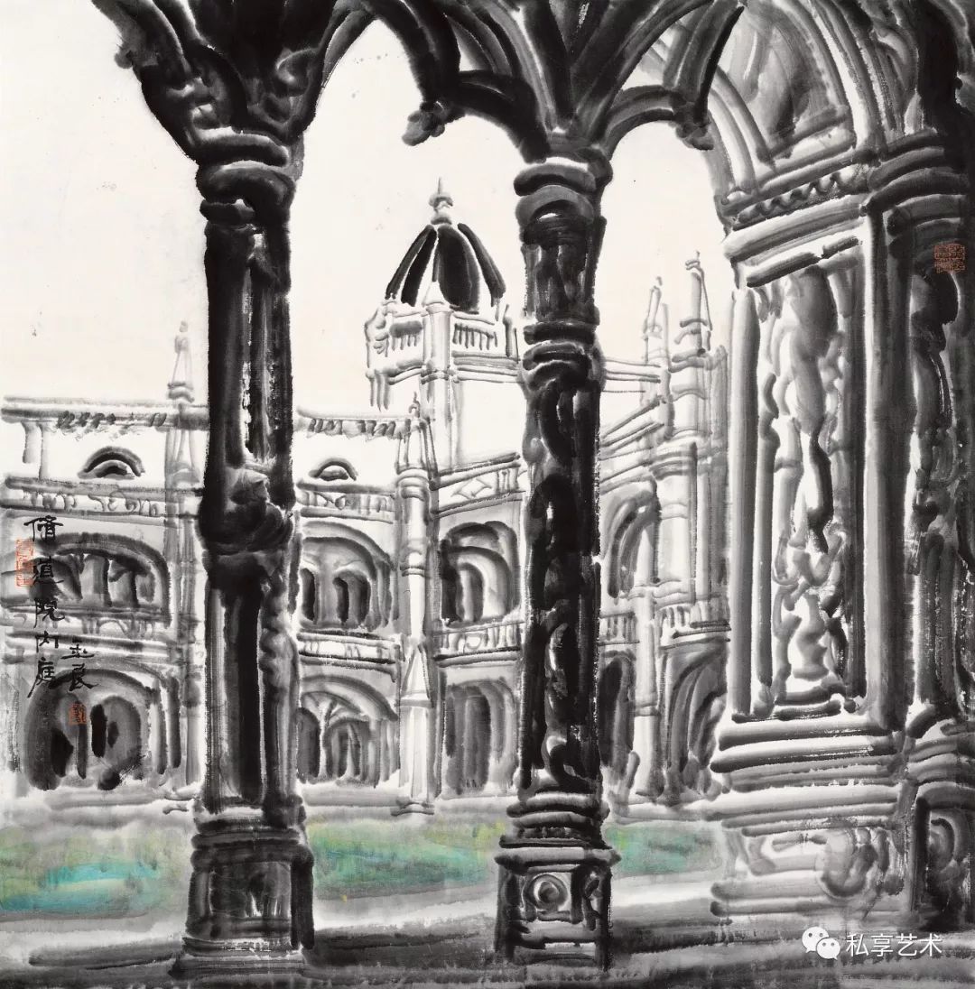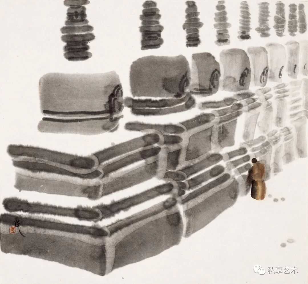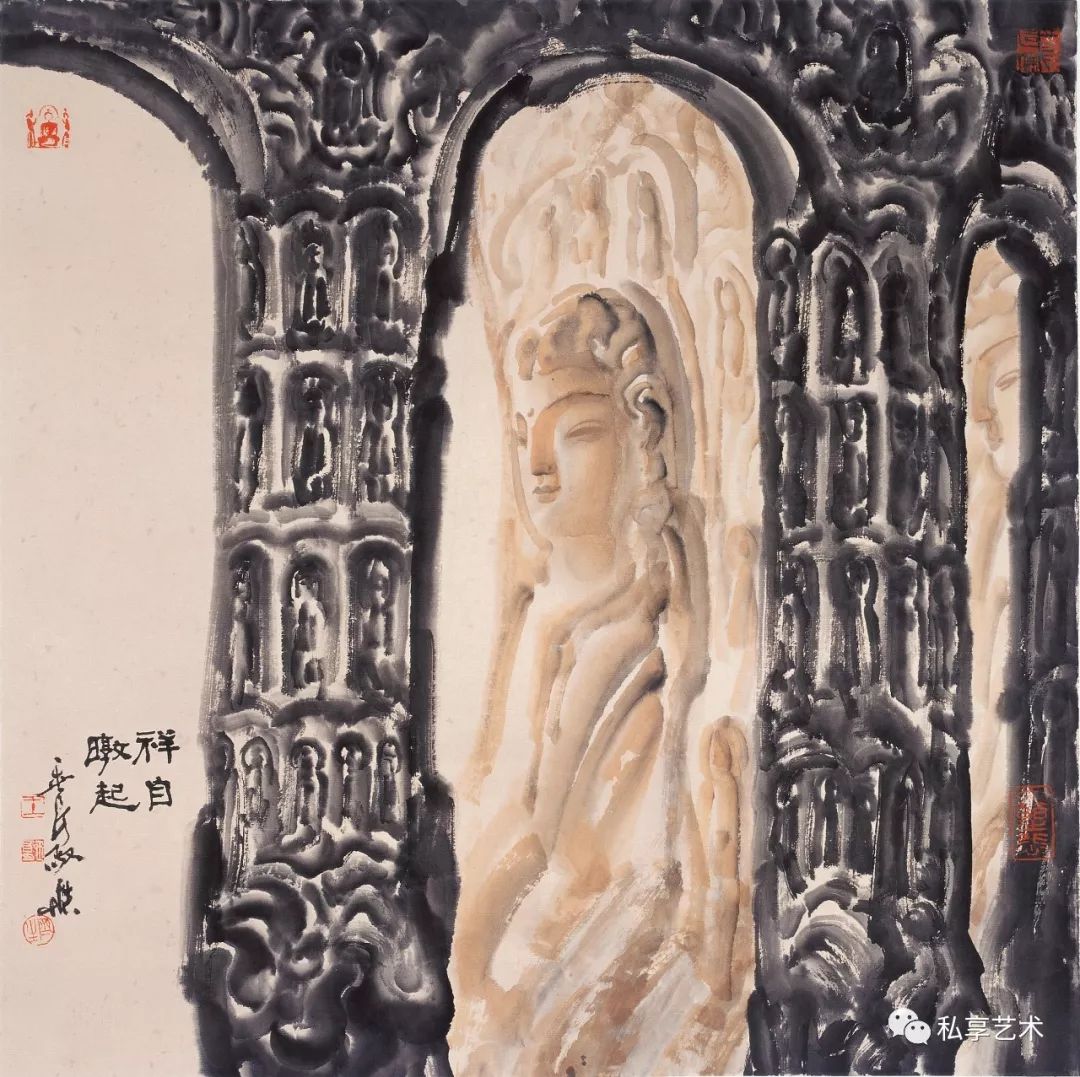 王玉良的水墨探索,与其说是在纯化语言,不如说是在纯化精神,因为在观照实景的同时已经有意境的构造与生发。与通常认为艺术品的特征在于它的物性和对象性的见解相反,王玉良认为创作的“艺术真理”恰在于创作的非对象性艺术作品以自己的方式开启存在看存在。这种开启即揭蔽,亦即存留者的“信仰之真”是在作品中发生的。作品之所以存在就是要“建立世界”和“展示大地”,为此他通过把一尊尊佛教造象、一座座教堂神殿作为他作品生成阐释的场域,来说明真神的发生:世界的建立不单是当下现实中的某种筑造,不单是一种纯然的设置,此建立乃是“信仰之美性”和“美之信仰性”的树立。