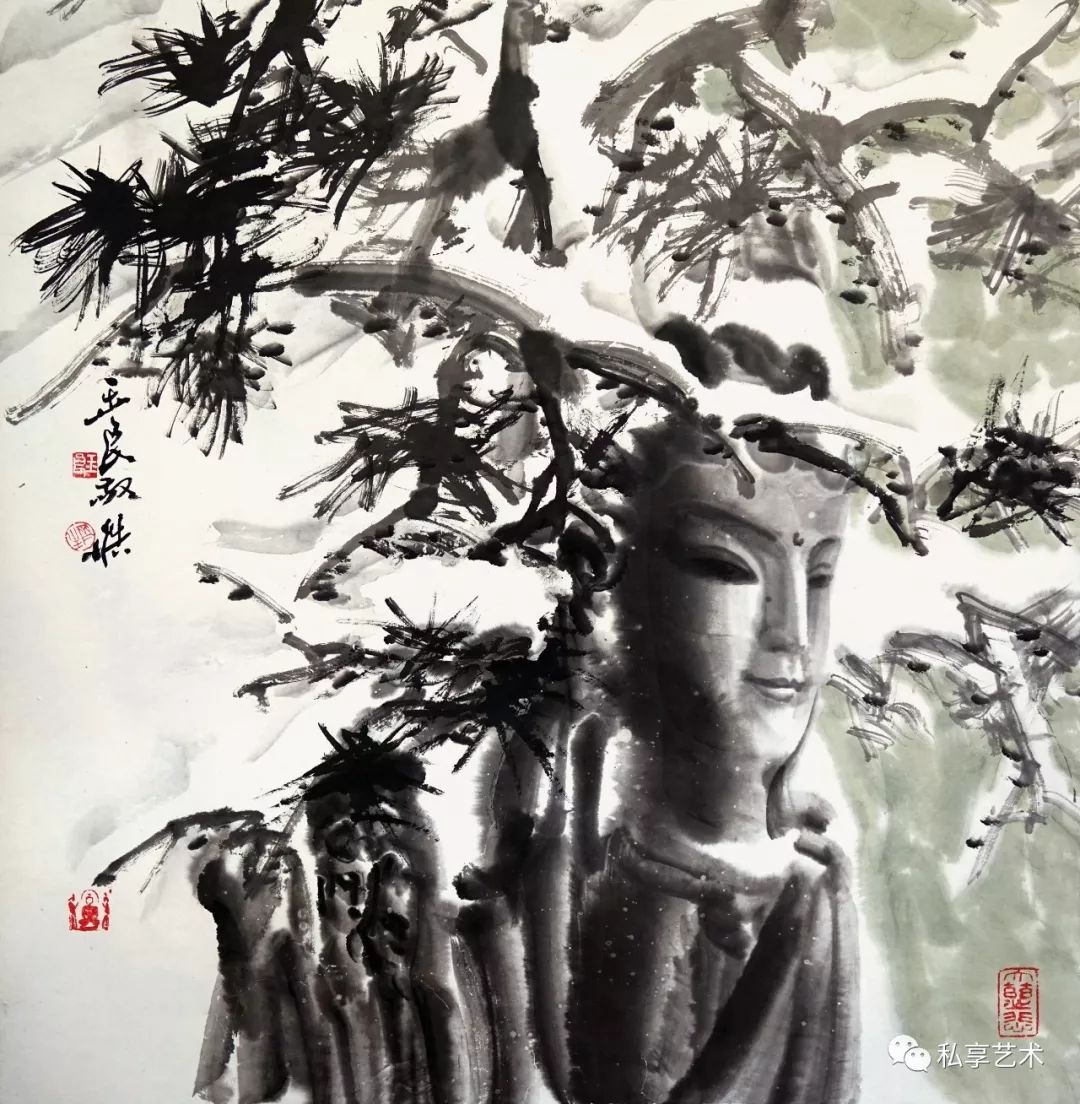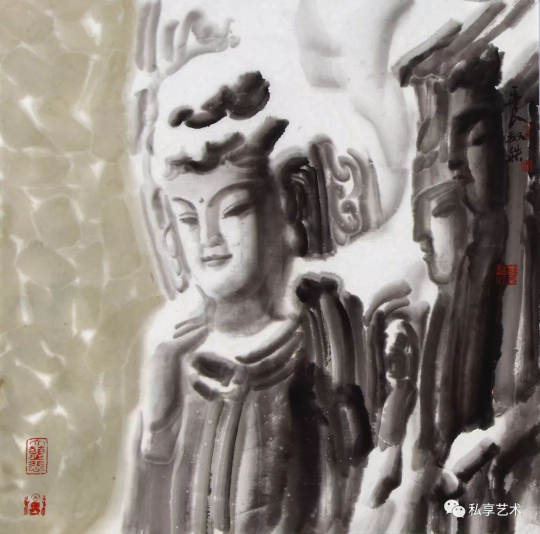 如果将王玉良的画放到当代中国画的群体中去考察,会发现他的画很难归于某个具体的类别,他以水墨的方式画出了摄影镜头中的造像的感觉,营造出了那种洞窟的氛围。他跳出了过去在传统范围内的那种画科的局限,在无法之法中开创了中国水墨画表现的新境界。那么,如果将其放到现代水墨画中去考察,他的画所表现出的现代性并不具有那种现代水墨的张力,又是以其温文尔雅的传统水墨的趣味反映出中国文化的内涵。王玉良将位于传统中国画技法主流之外的没骨法参以现代性的表现,以黑与白、光与影融汇为水墨的交响。