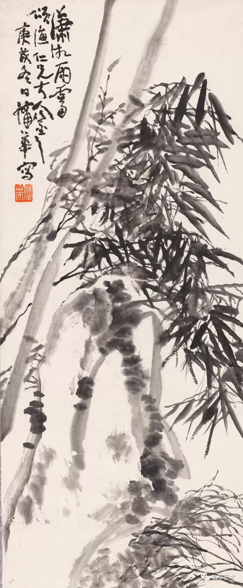蒲华之作,题材尤显文人趣味,梅、兰、竹、菊、荷最为多见,偶作牡丹,水仙、天竹,月季之属,艳而淡,朴而拙,毫无媚世态,皆是自适风度。因之,我以为蒲华之作将日益为世所重。蒲华善书,长锋挥写,缠绵奇宕,奔逸有如傅青主,虚灵让之,夭矫无逊,令人想见一个痛快淋漓!