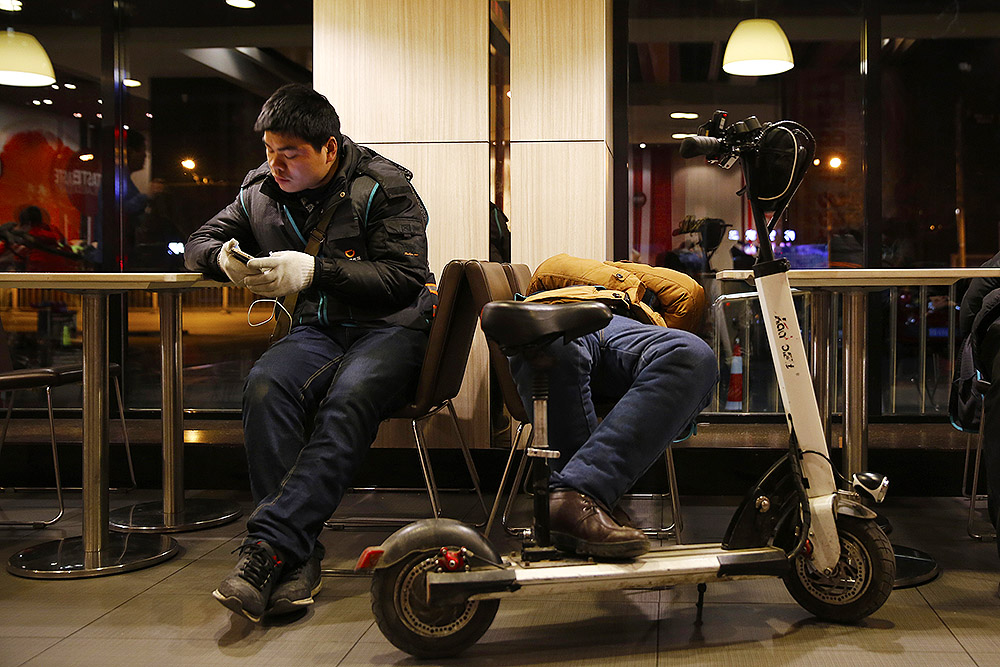 快餐店里等待订单的代驾员。一名代驾员脚踩着电动滑板车,就躺在椅子上和衣入睡。