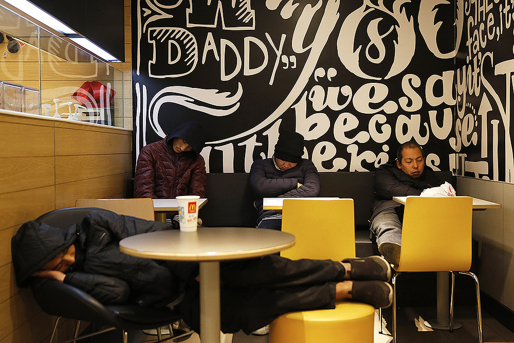 工体附近一家麦当劳,店面宽敞,而且有很多隔间,顾客和在此过夜的人之间互不干扰。即使遇上北京最寒冷的冬天,店内的暖气也能让他们有个温暖的睡眠。