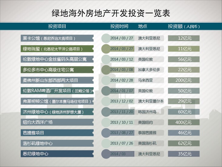 绿地搭上了一轮中国人海外置业的热潮。巴克莱在调查访问了中国2000名千万富豪后发现,近半数中国富人打算在未来五年内移民。而全球房地产独立调查公司RCA数据也显示:仅在去年,中国投资者在海外购买了超过840亿元的商业地产。这比之前四年的总额还要高。