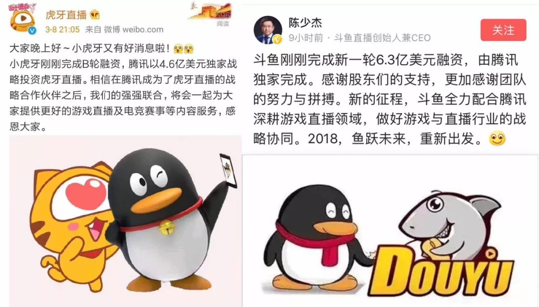 4.斗鱼宣布获得腾讯6.3亿美金投资,虎牙宣布获腾讯4.6亿美元投资