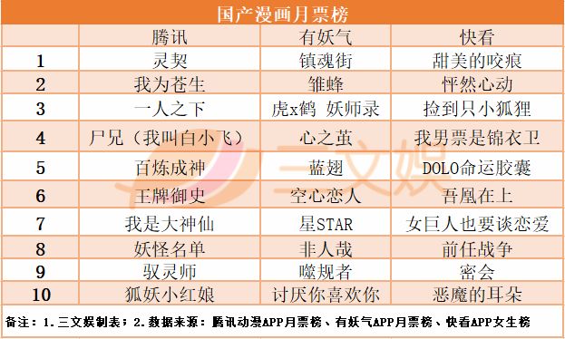 国产漫画方面,截至10日,腾讯漫画月票榜首与上周相同,仍为《灵契》,上周月票数量为6125张,紧随其后的是《我为苍生》和《一人之下》。相比于上几周,《妖怪名单》为新上榜作品,自2014年4月14日开始连载,以恋爱、都市、玄幻、校园、热情、搞笑为标签。综合而言,上周榜单变化不大,几乎都是榜单老面孔,作品人气值大部分为30亿以上,有几部超百亿、甚至过200亿。