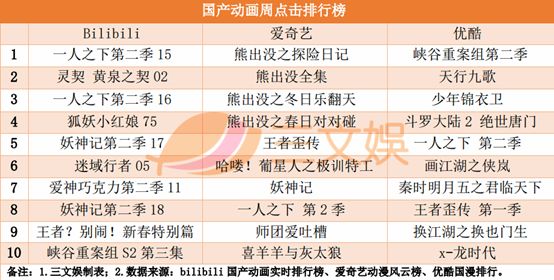 国产动画方面,上周B站排行榜第一名仍为《一人之下》,上周有两集上榜。《狐妖小红娘》、《妖神记》、《爱神巧克力》等作品的热度也一直居高不下。上周新上榜作品为《峡谷重案组》,该动画是一部集悬疑、搞笑、奇幻、励志为一身的作品。