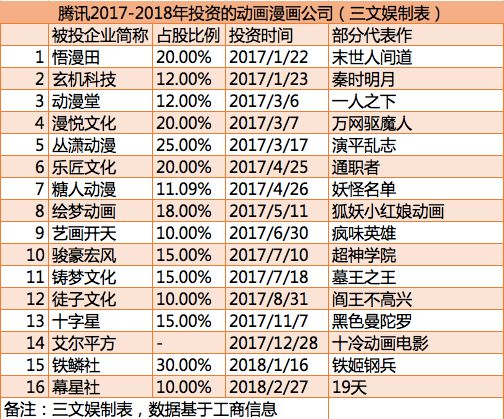 动漫领域腾讯已经入局六年,腾讯动漫平台业内数一数二。这两年它更是加大布局力度。去年腾讯投了玄机科技、绘梦动画、动漫堂、徒子文化等14家动画漫画公司,今年头两个月腾讯就又投资了幕星社(4000万占10%)、铁鳞社(数百万)等,还有更多家在完成和披露的路上。