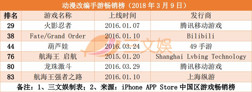 动漫改编手游畅销榜方面,众手游和往常表现几乎差不多,上榜的都是老面孔。《火影忍者》和《Fate/Grand Order》、《葫芦娃》依旧占据榜单前三,剩下的《航海王》系列、《龙珠激斗》也保持在畅销榜前100名以内。