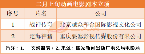 在动画电影剧本立项方面,二月上旬一共立项2部。
